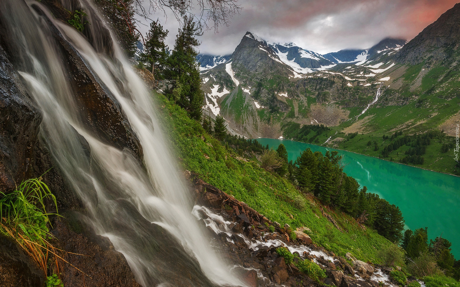 Edytor tapety: Wodospad i drzewa na skałach