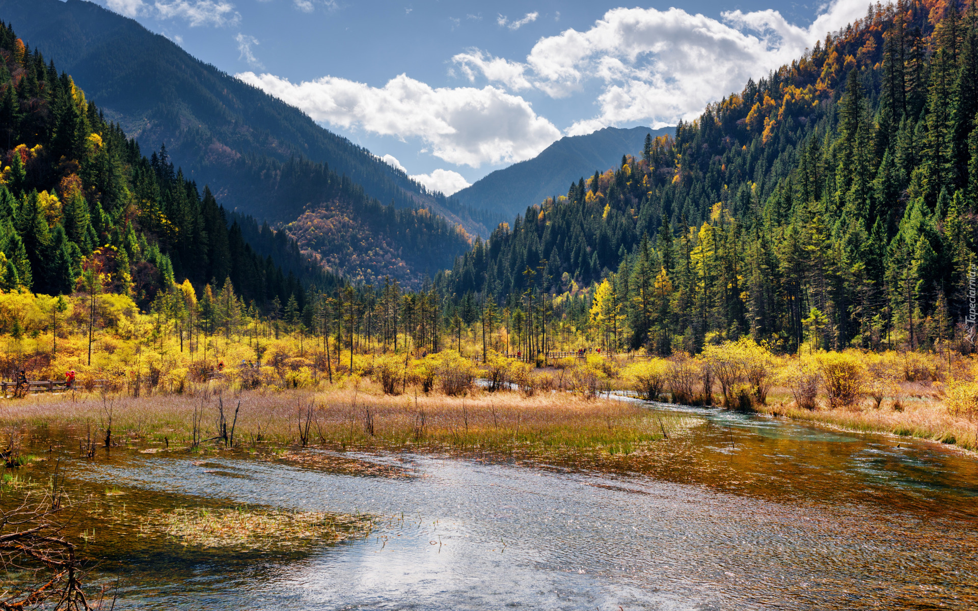 Edytor tapety: Rzeka pośród lasów w Parku Narodowym Jiuzhaigou