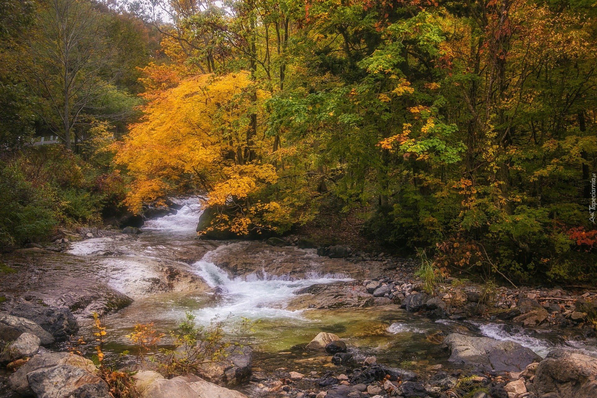 Edytor tapety: Pożółkłe drzewa nad kamienistą rzeką w lesie