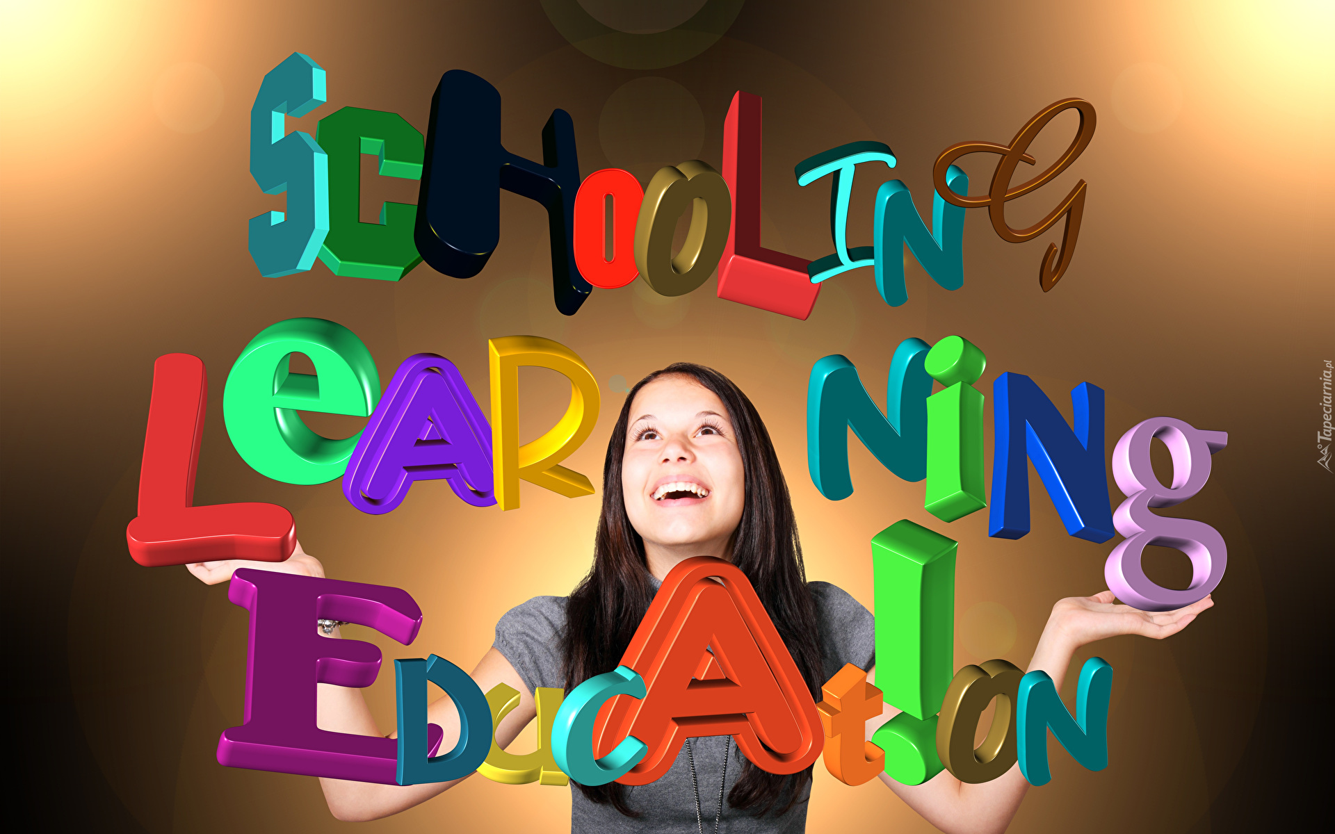 Edytor tapety: Kolorowy napis wokół uśmiechniętej dziewczynki