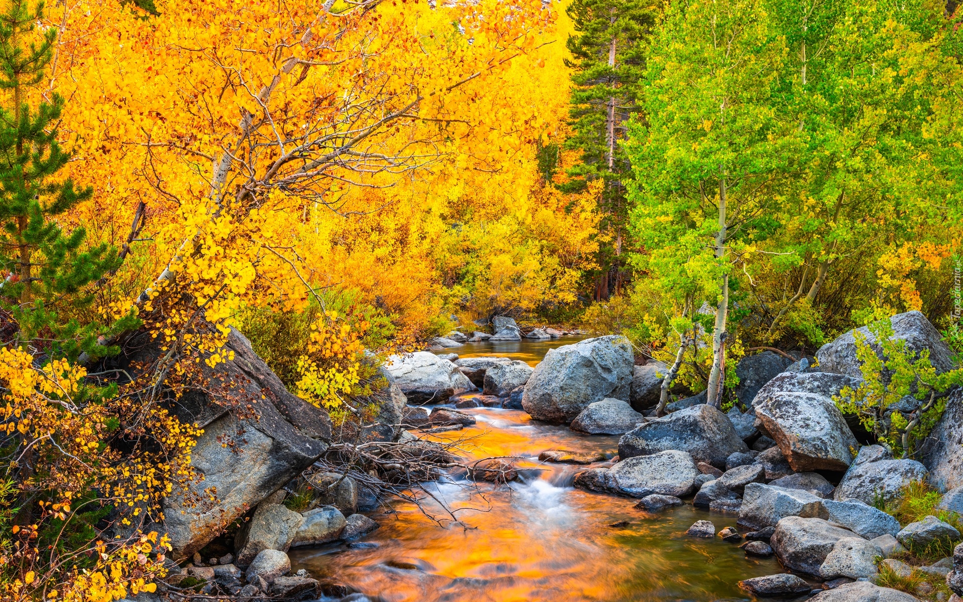 Edytor tapety: Głazy na brzegach rwącej rzeki pośród jesiennych drzew