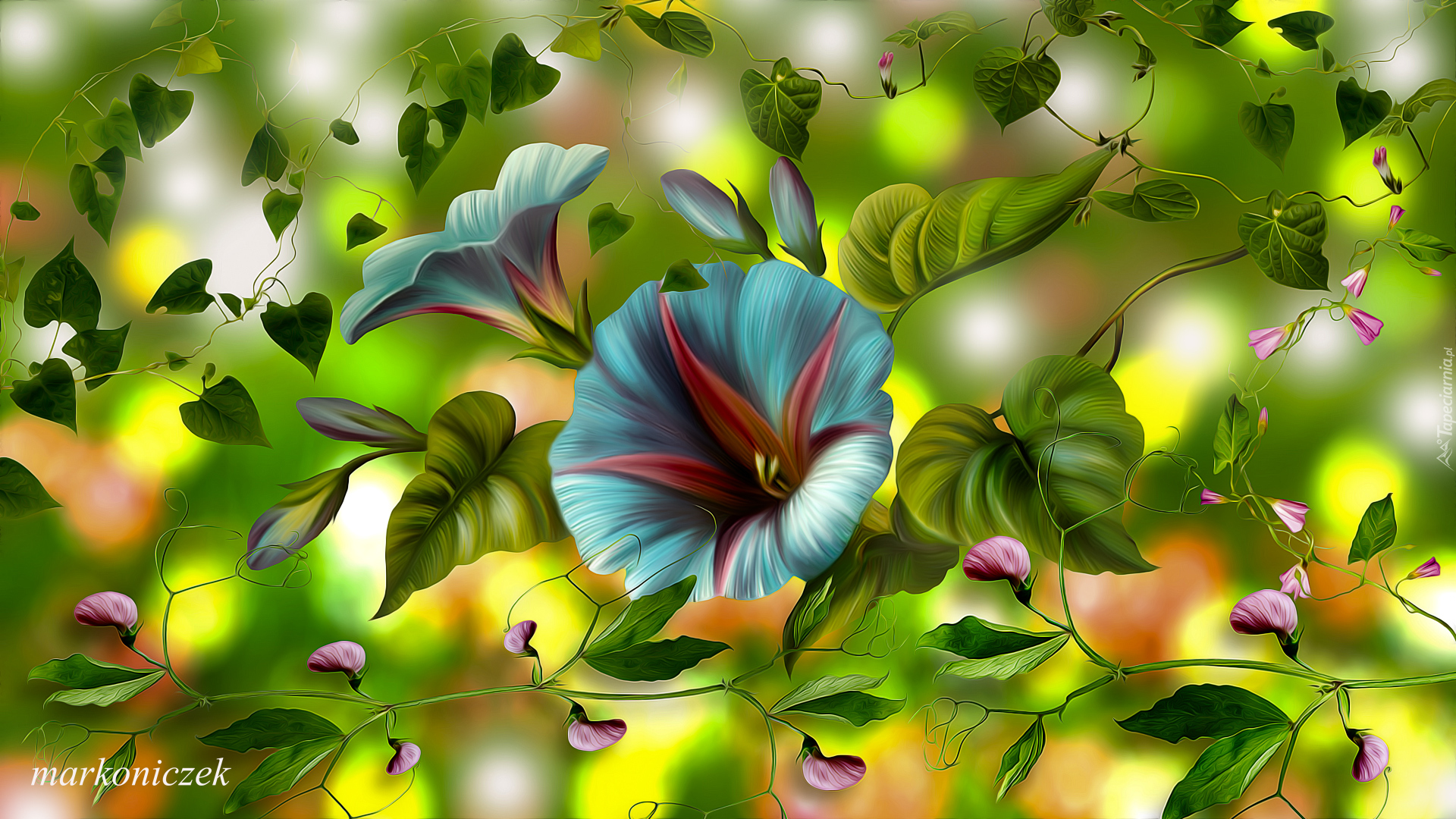 Edytor tapety: Niebieski powój z liśćmi w grafice