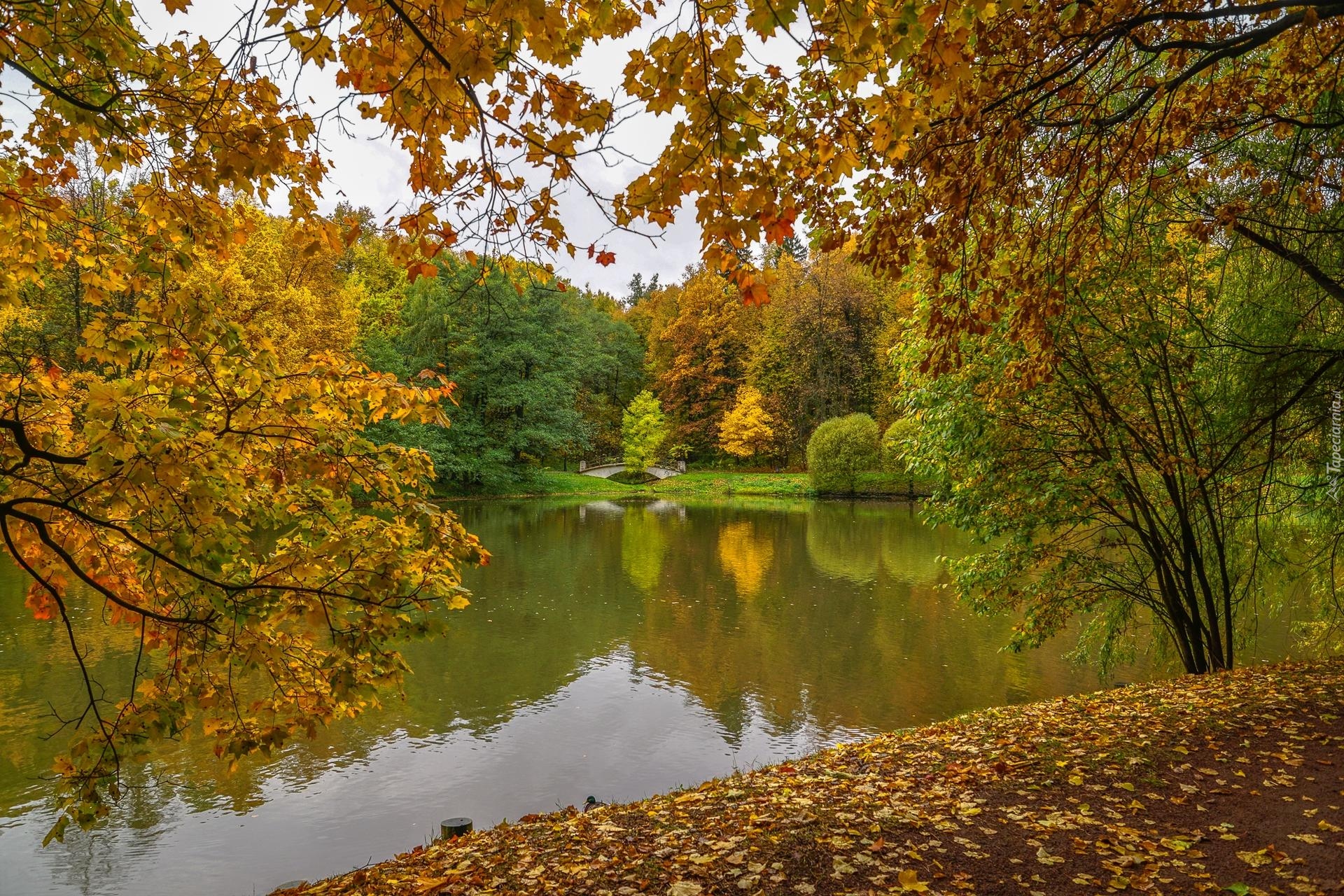 Edytor tapety: Kolorowa jesień nad stawem w parku