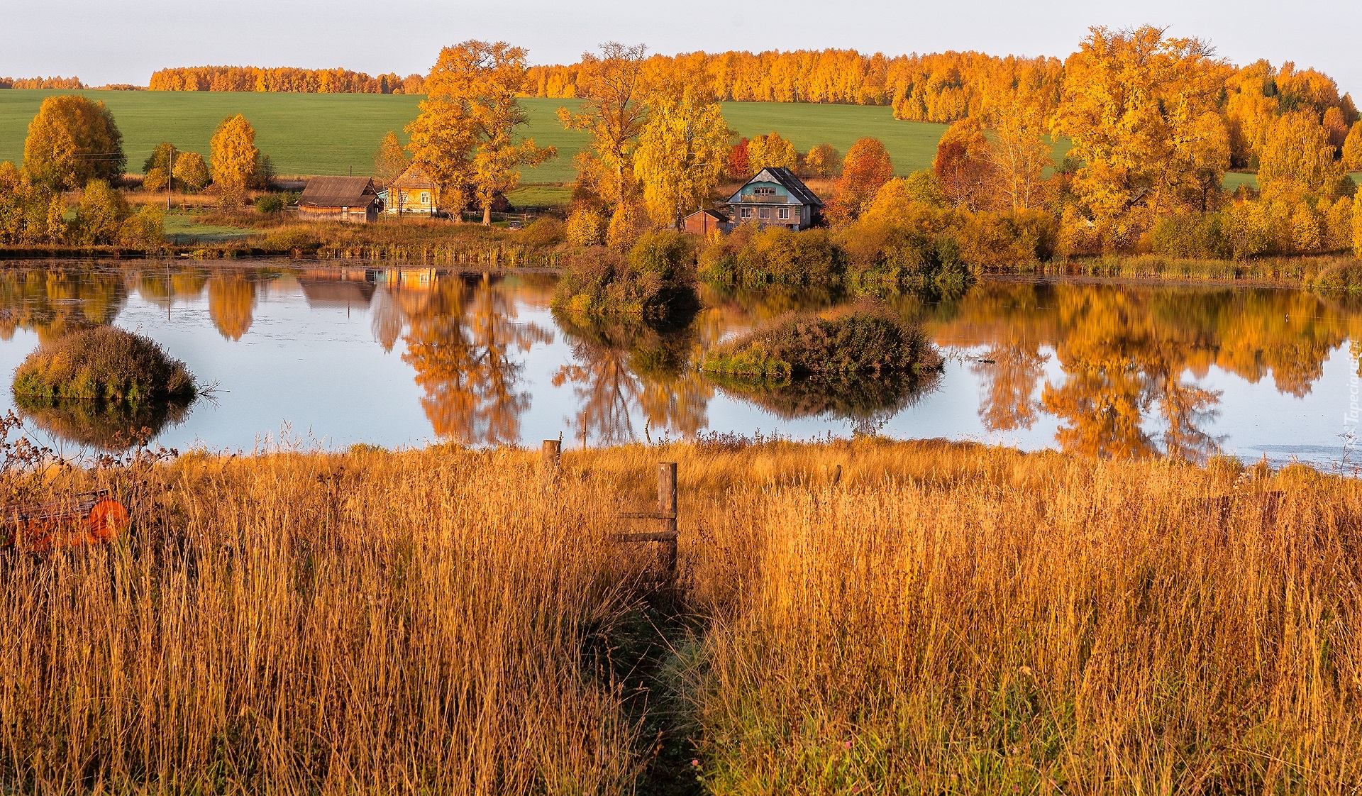 Edytor tapety: Pożółkła trawa i drzewa nad rzeką