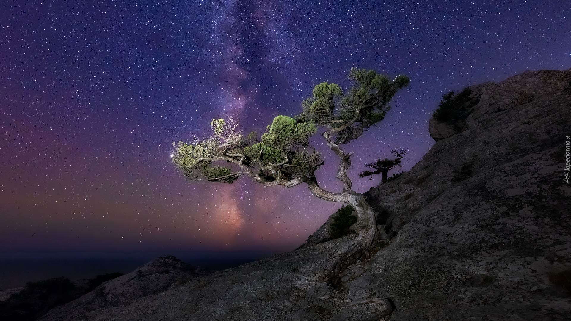 Edytor tapety: Sosna na skale pod gwiaździstym niebem