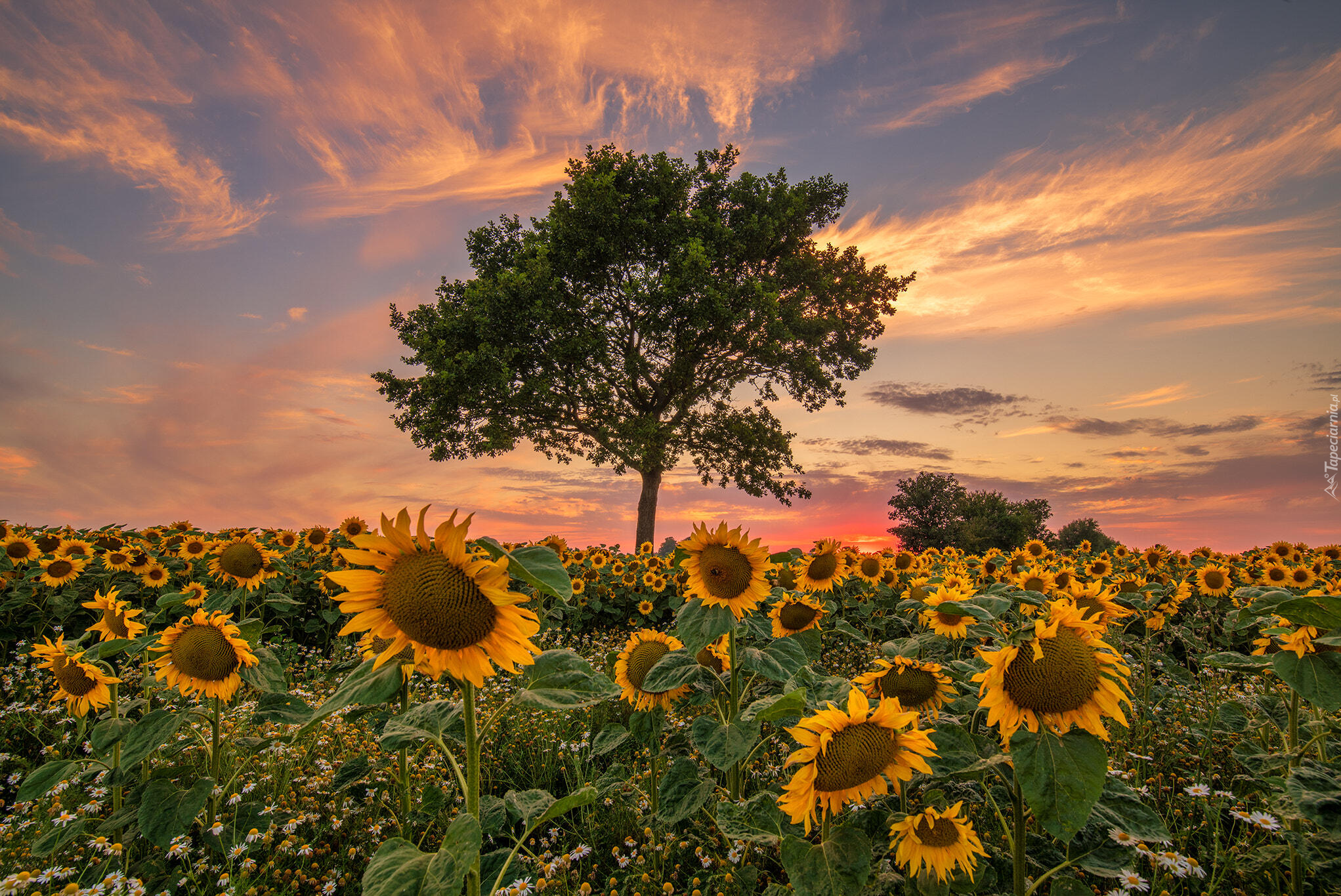Edytor tapety: Drzewo na polu słoneczników