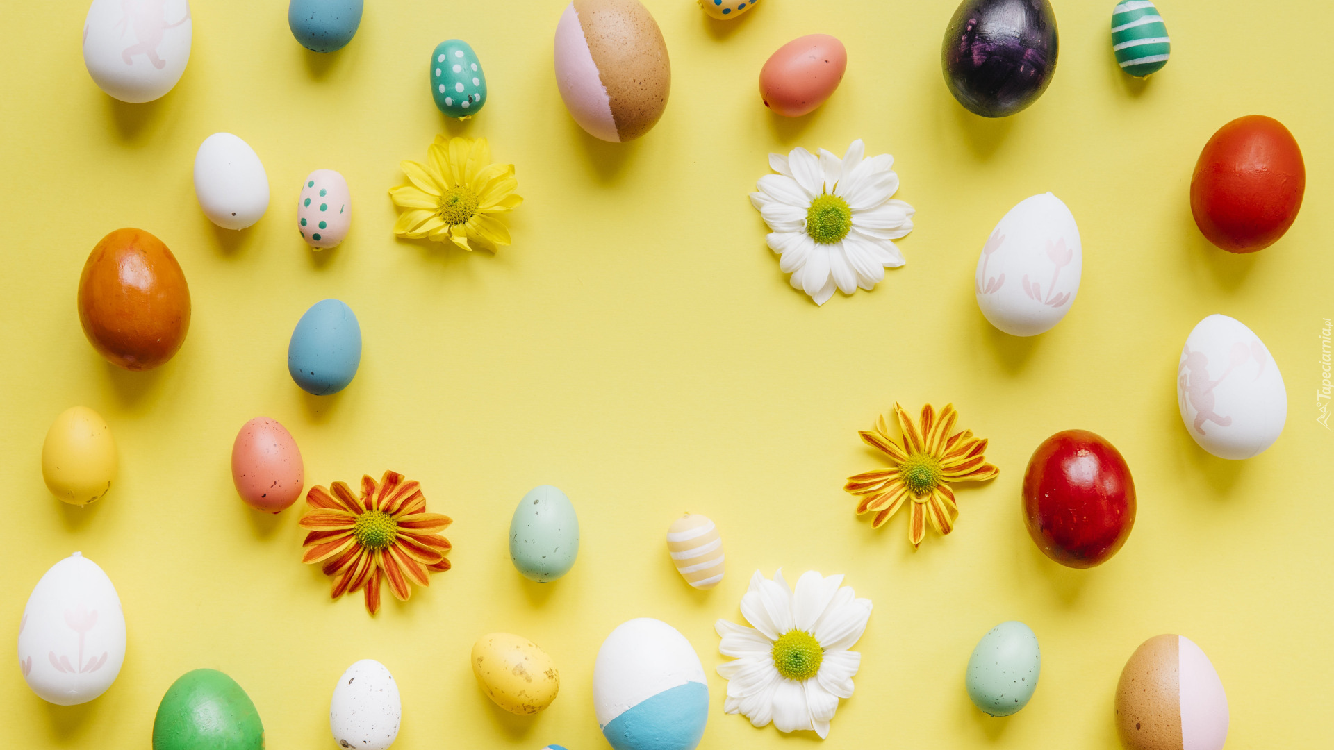 Edytor tapety: Kwiaty pośród kolorowych pisanek