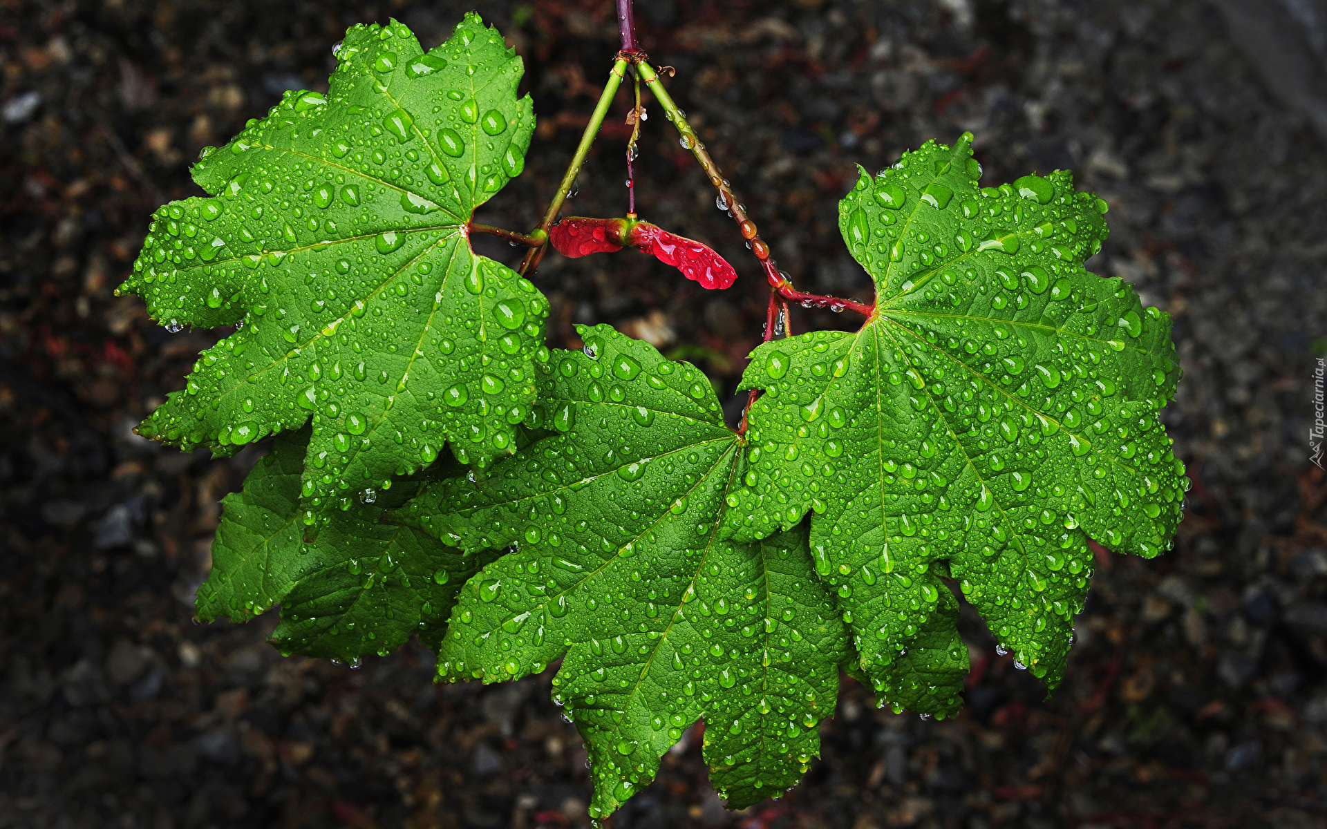 Edytor tapety: Gałązka klonu z zielonymi mokrymi liśćmi