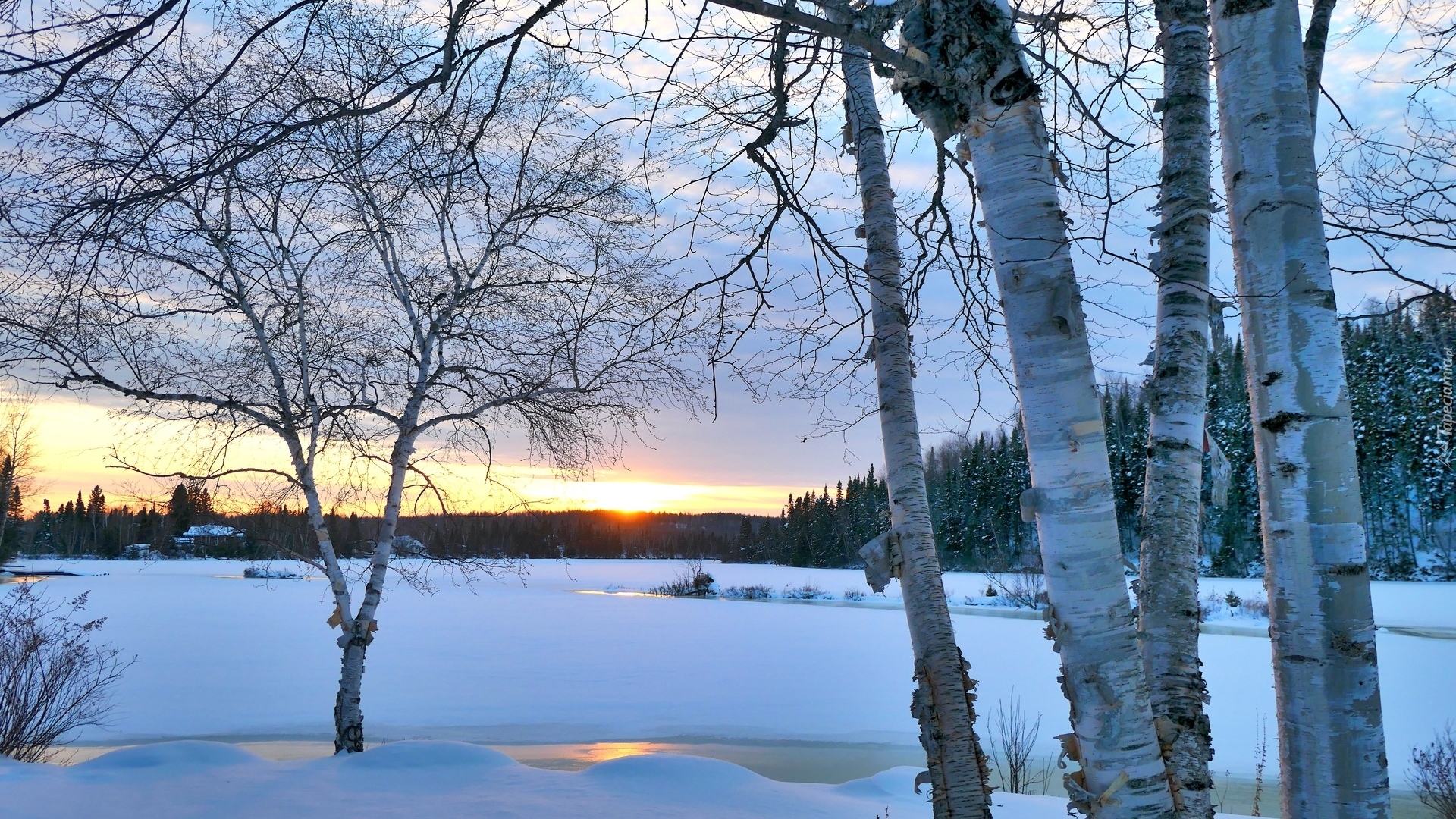 Edytor tapety: Brzozy na brzegu zaśnieżonego jeziora