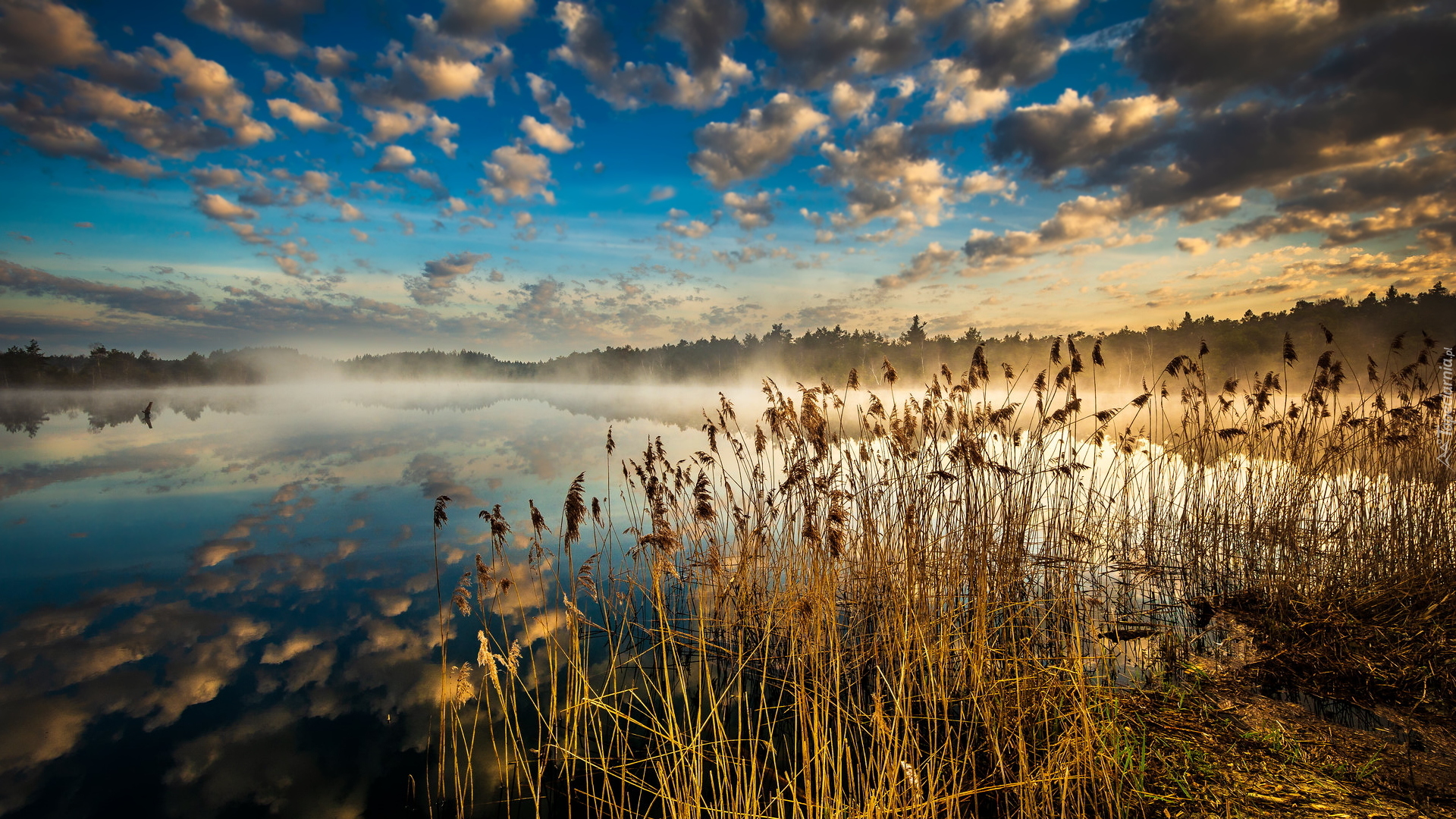 Edytor tapety: Szuwary na brzegu zamglonego jeziora