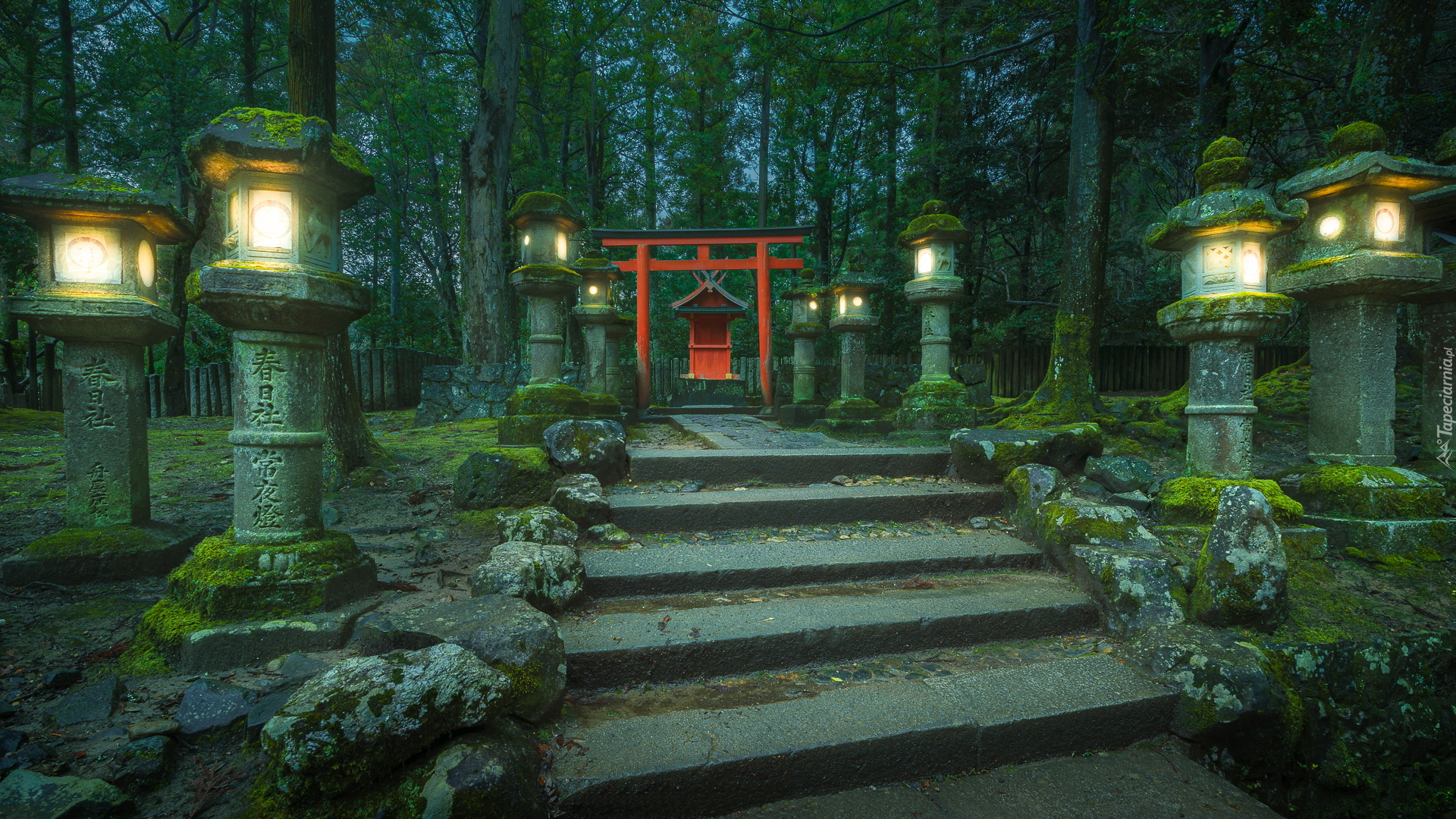 Edytor tapety: Omszałe latarnie przy schodach prowadzących do bramy tori