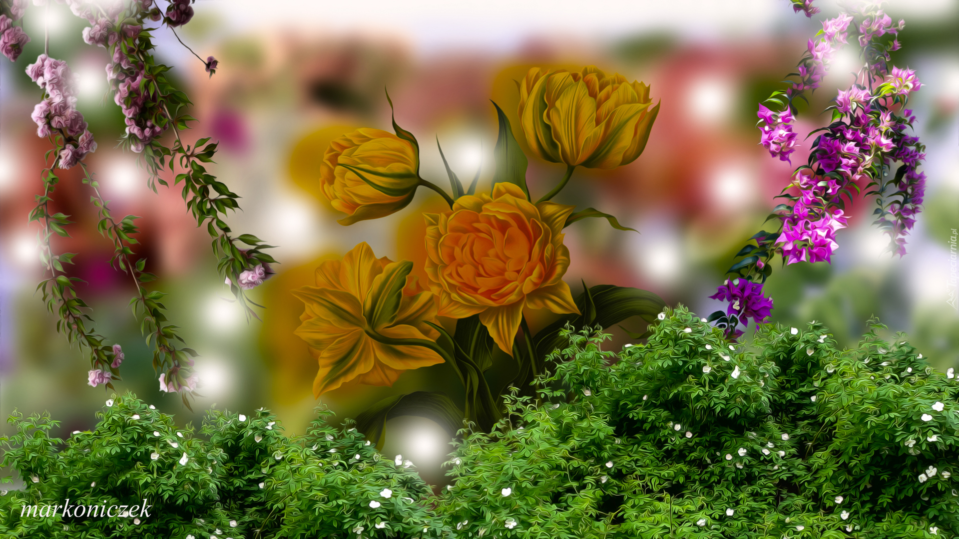 Edytor tapety: Żółte tulipany pośród kwitnących krzewów w grafice