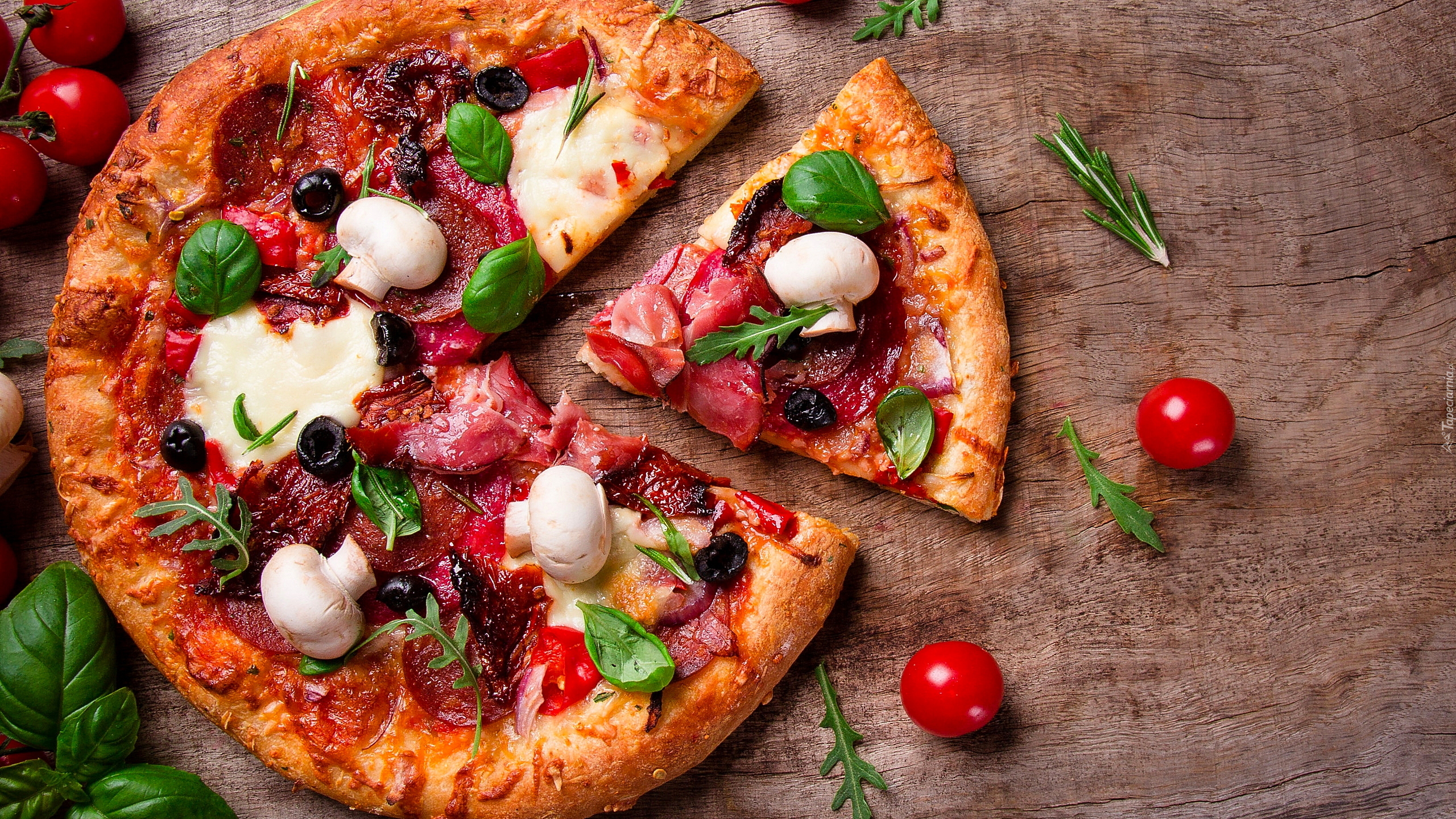 Edytor tapety: Pizza z szynką i pieczarkami na drewnie