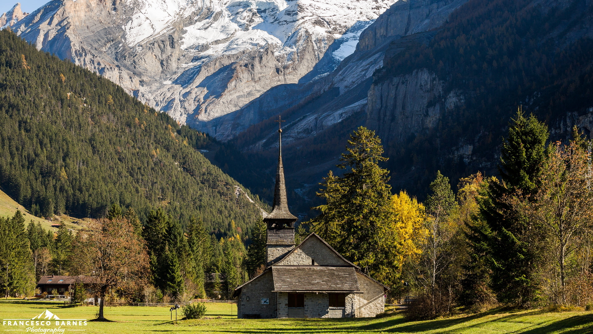 Edytor tapety: Kościół w Kandersteg na tle Alp Szwajcarskich