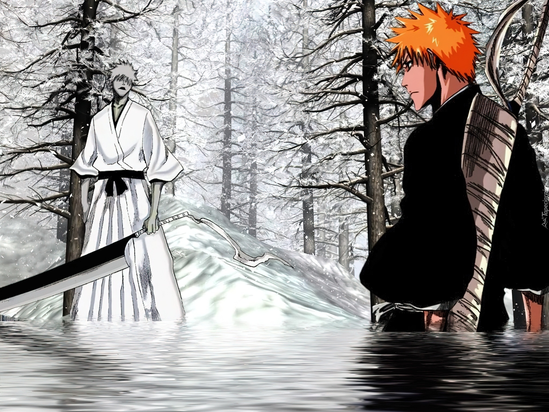 Edytor tapety: Bleach, postacie, maczeta, rzeka, las