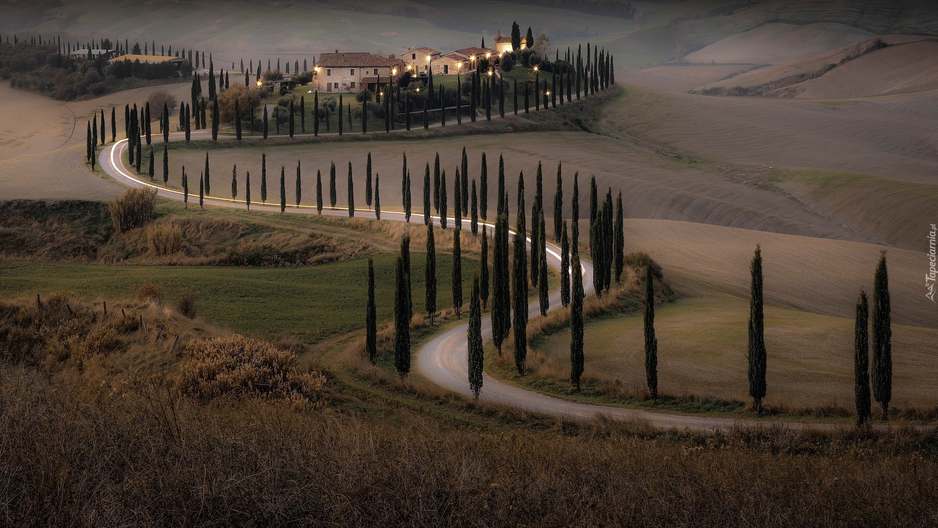 Edytor tapety: Droga wśród cyprysów i domy na wzgórzach Toskanii