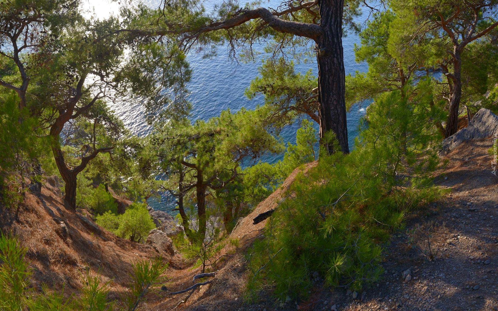 Edytor tapety: Drzewa na skarpie nad jeziorem