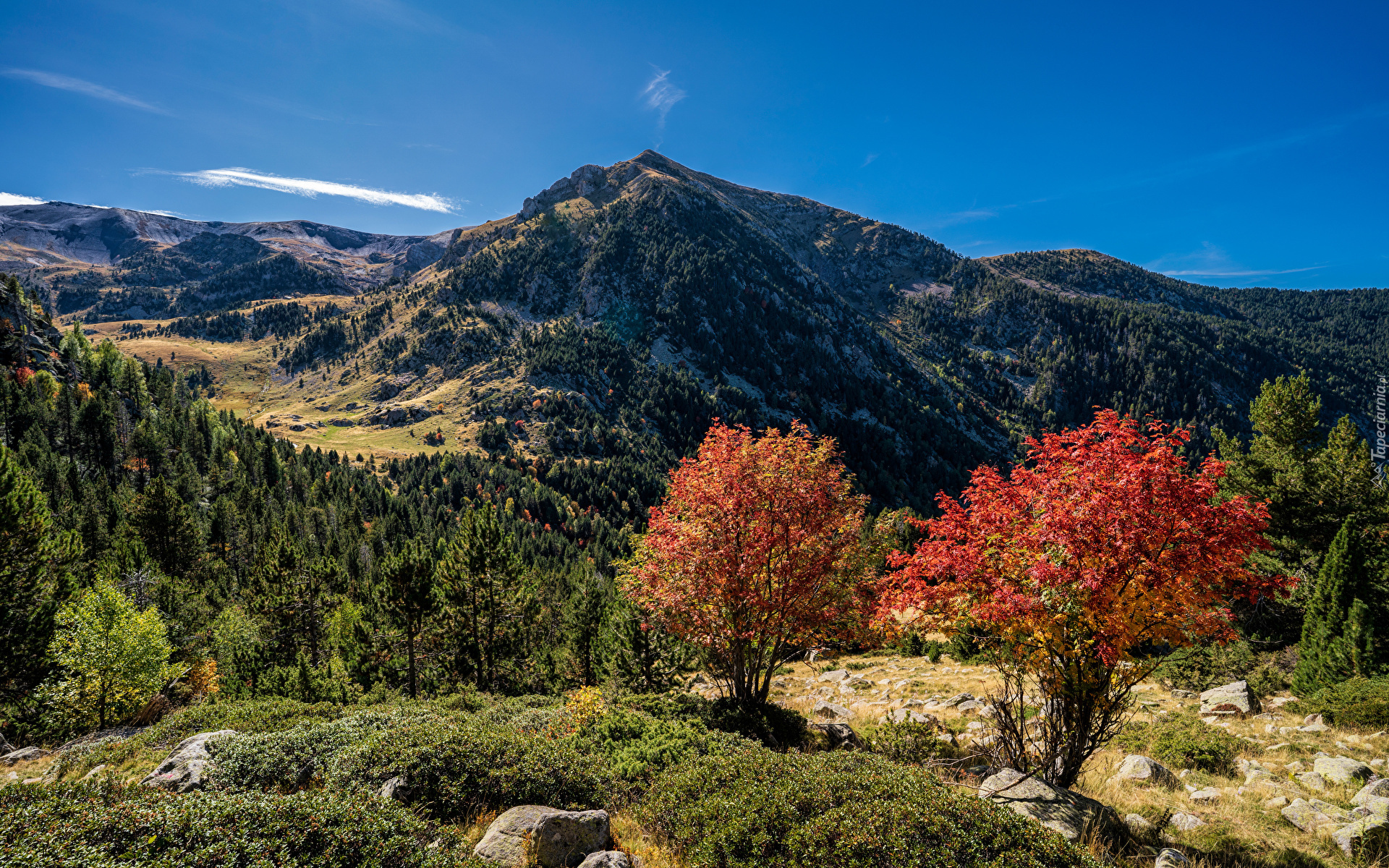 Edytor tapety: Kolorowe drzewa na tle gór
