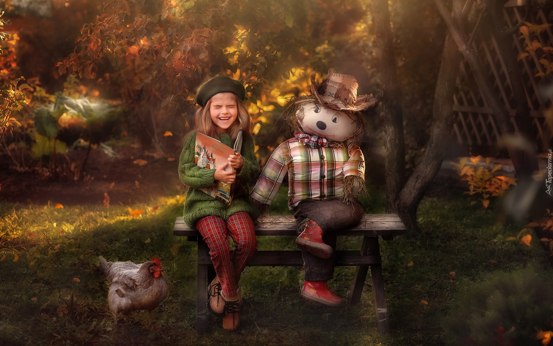 Edytor tapety: Roześmiana dziewczynka z dużą szmacianą lalką na ławce