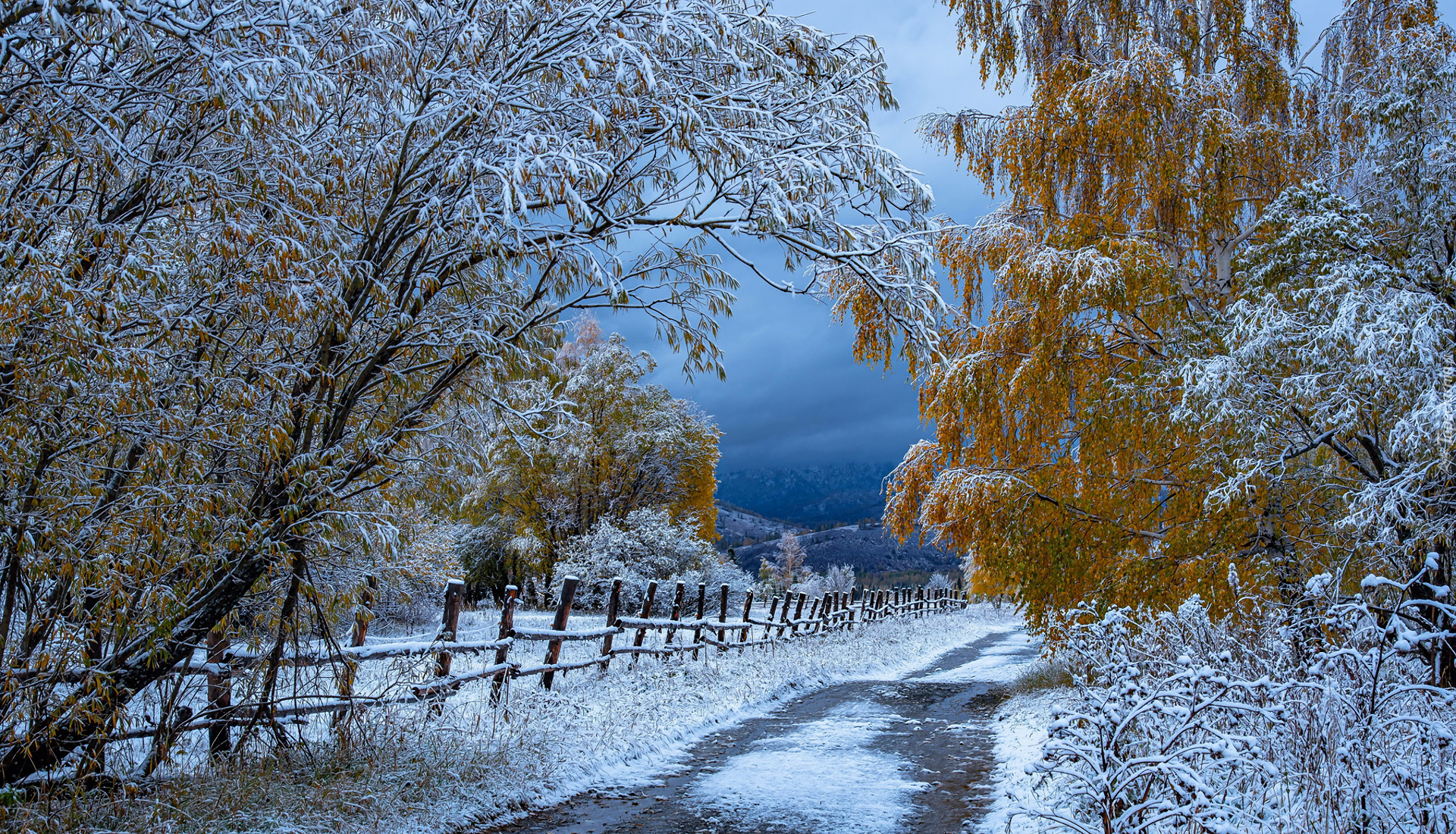 Edytor tapety: Droga między ośnieżonymi drzewami