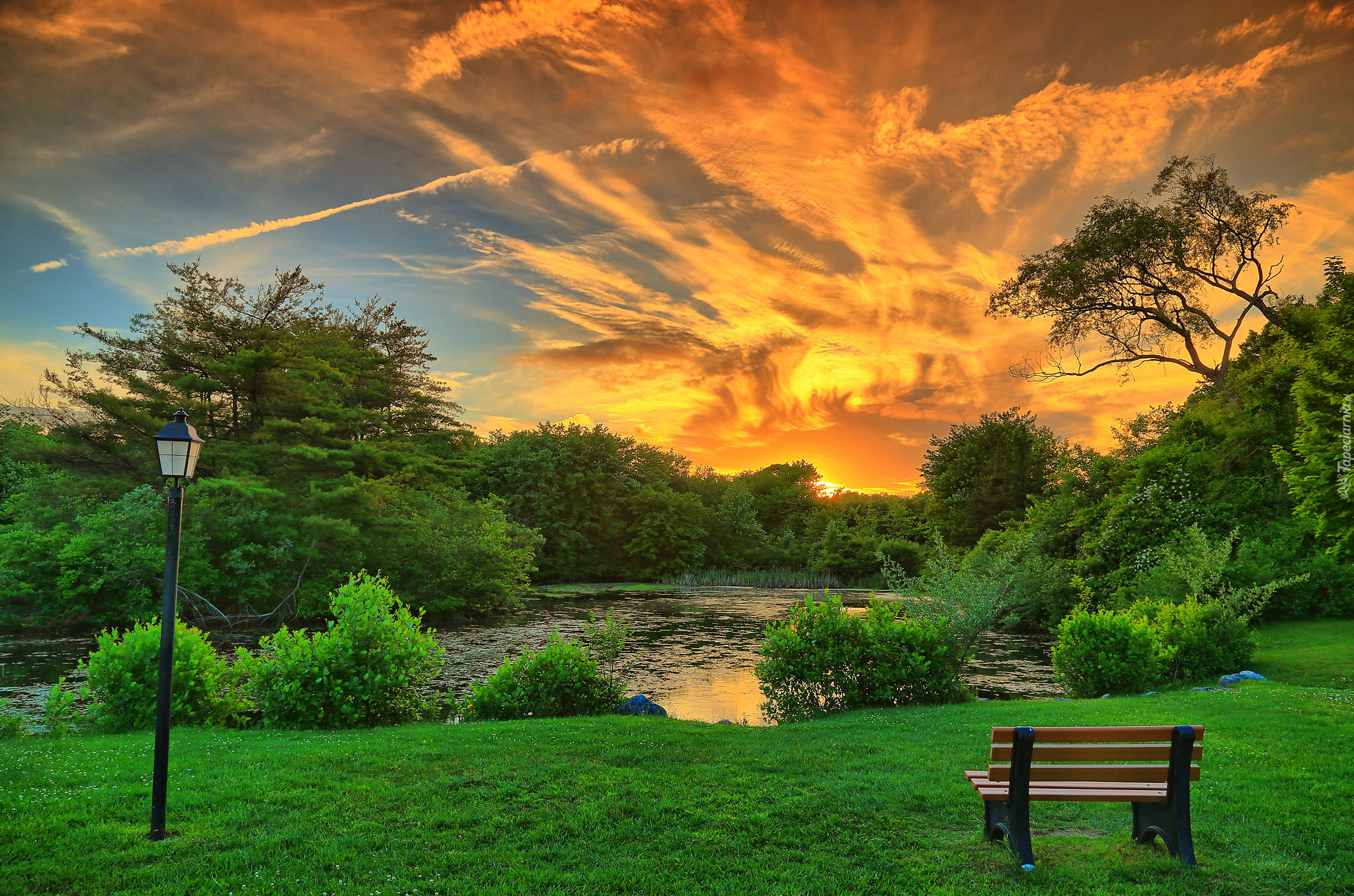 Edytor tapety: Ławka i latarnia nad stawem w parku