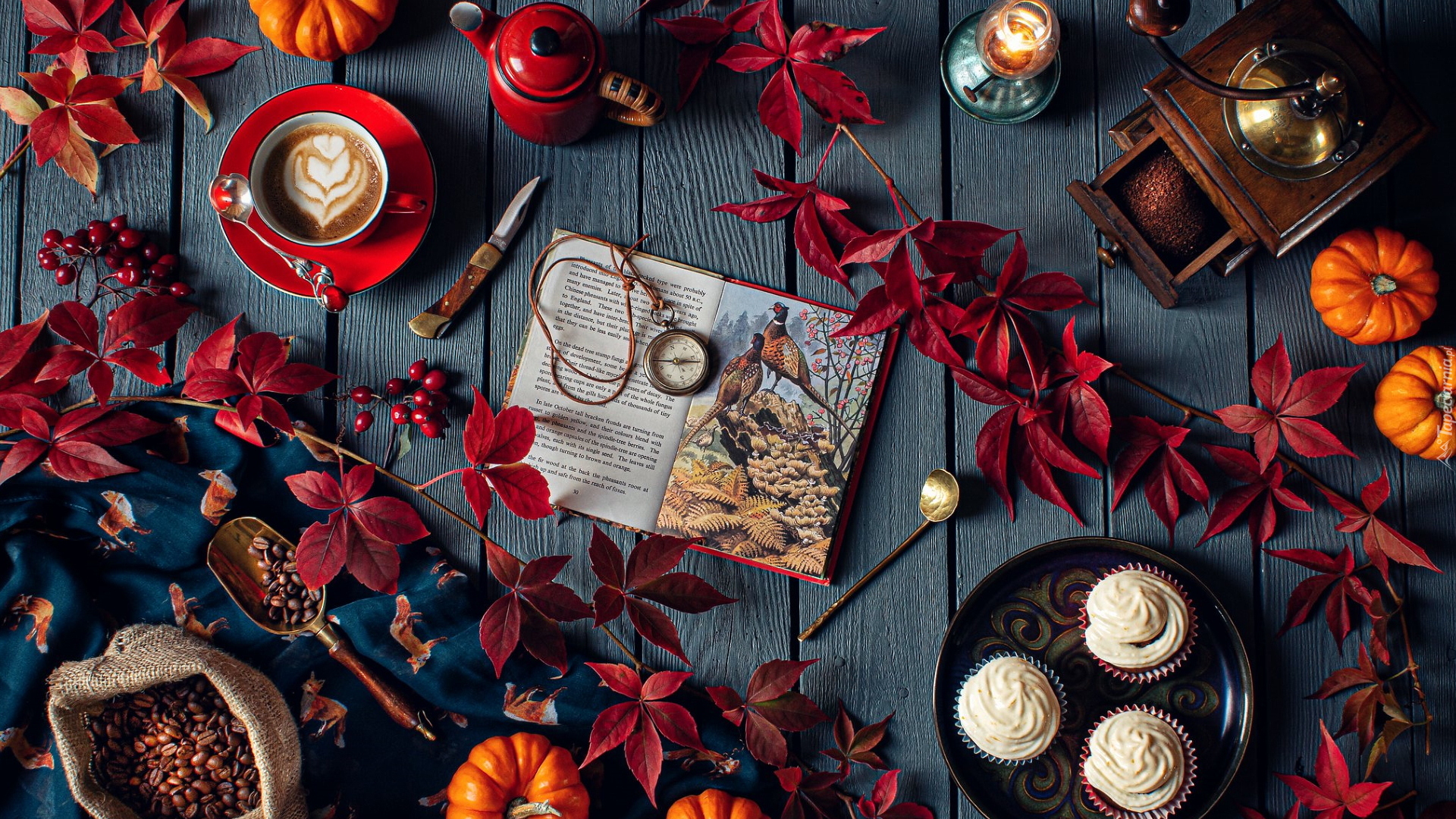 Edytor tapety: Książka i babeczki na talerzyku pośród bordowych liści