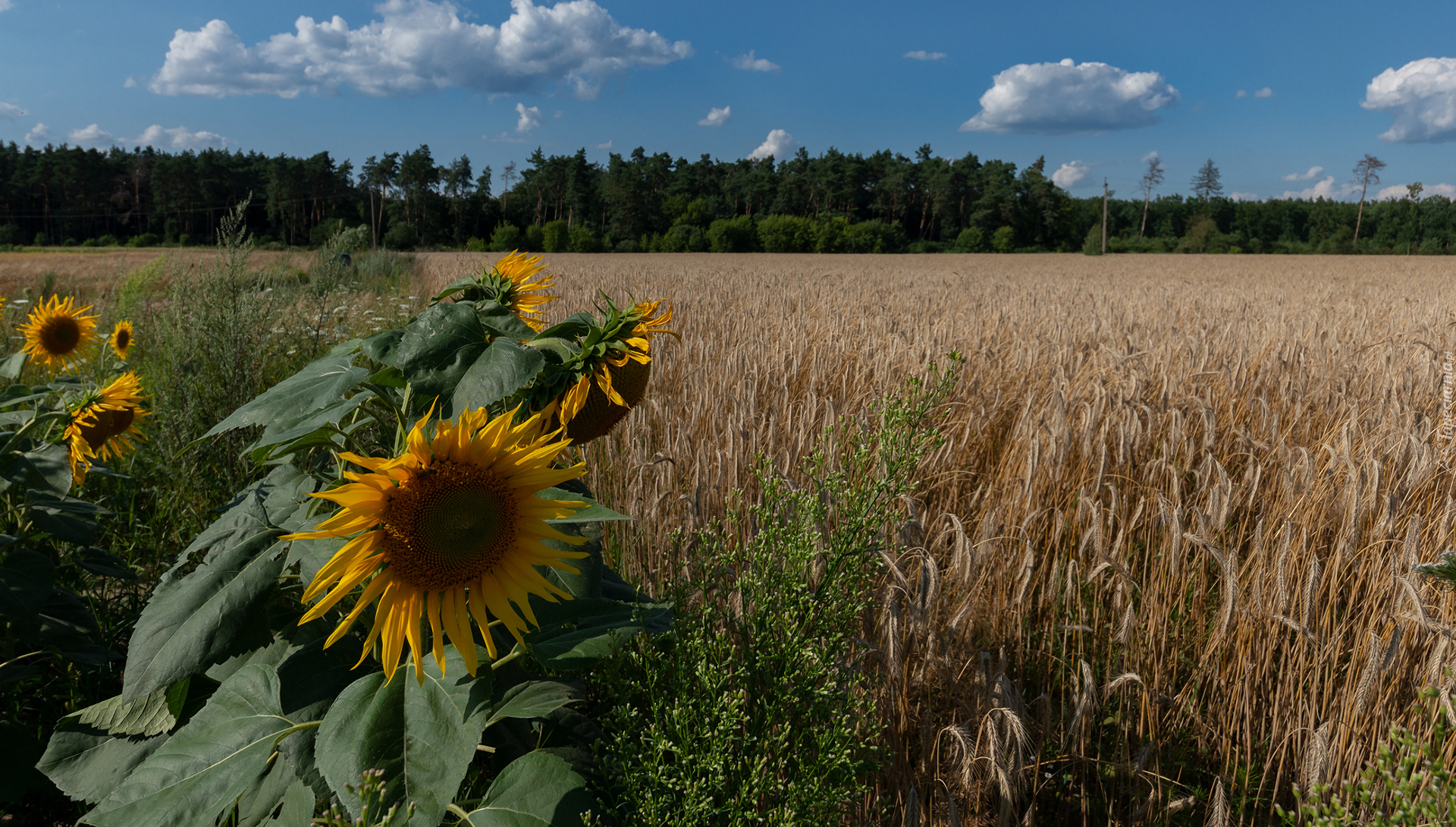 Edytor tapety: Słoneczniki obok dojrzałego zboża na polu