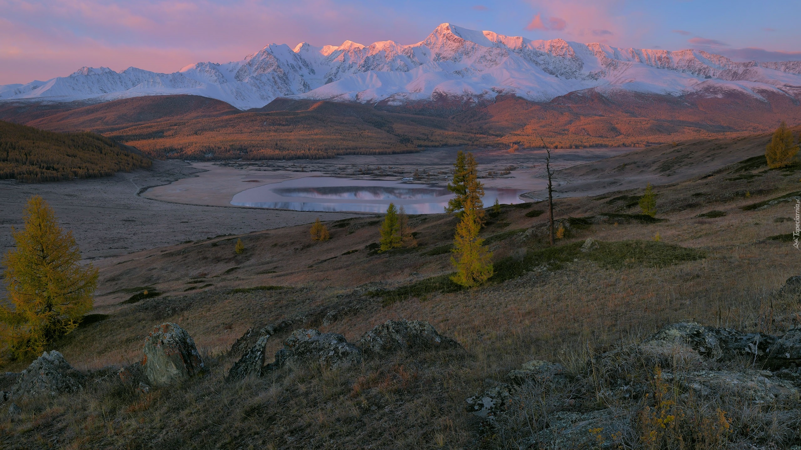 Edytor tapety: Widok na jezioro i ośnieżone góry w oddali