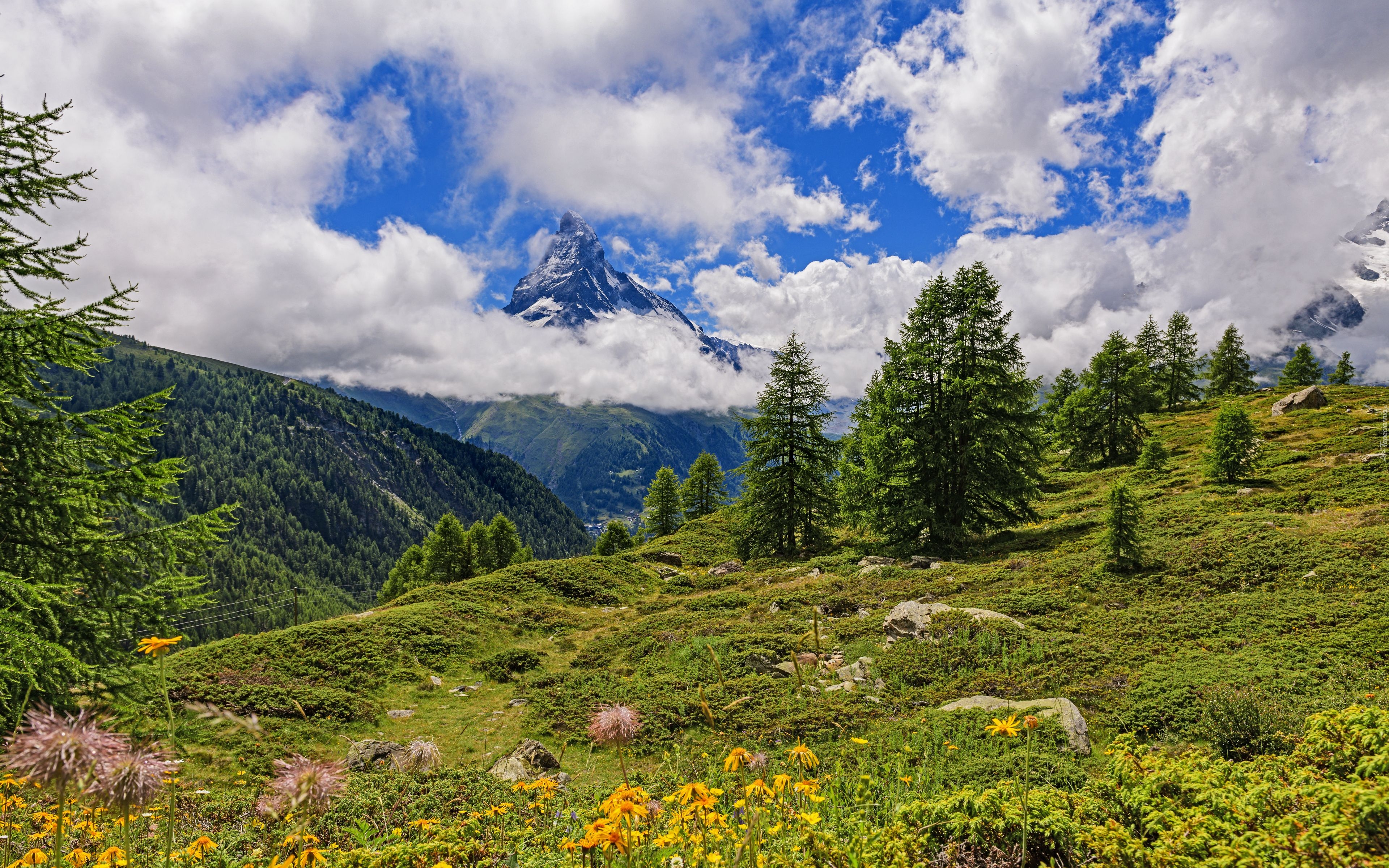 Edytor tapety: Widok z łąki na szczyt otulony chmurami