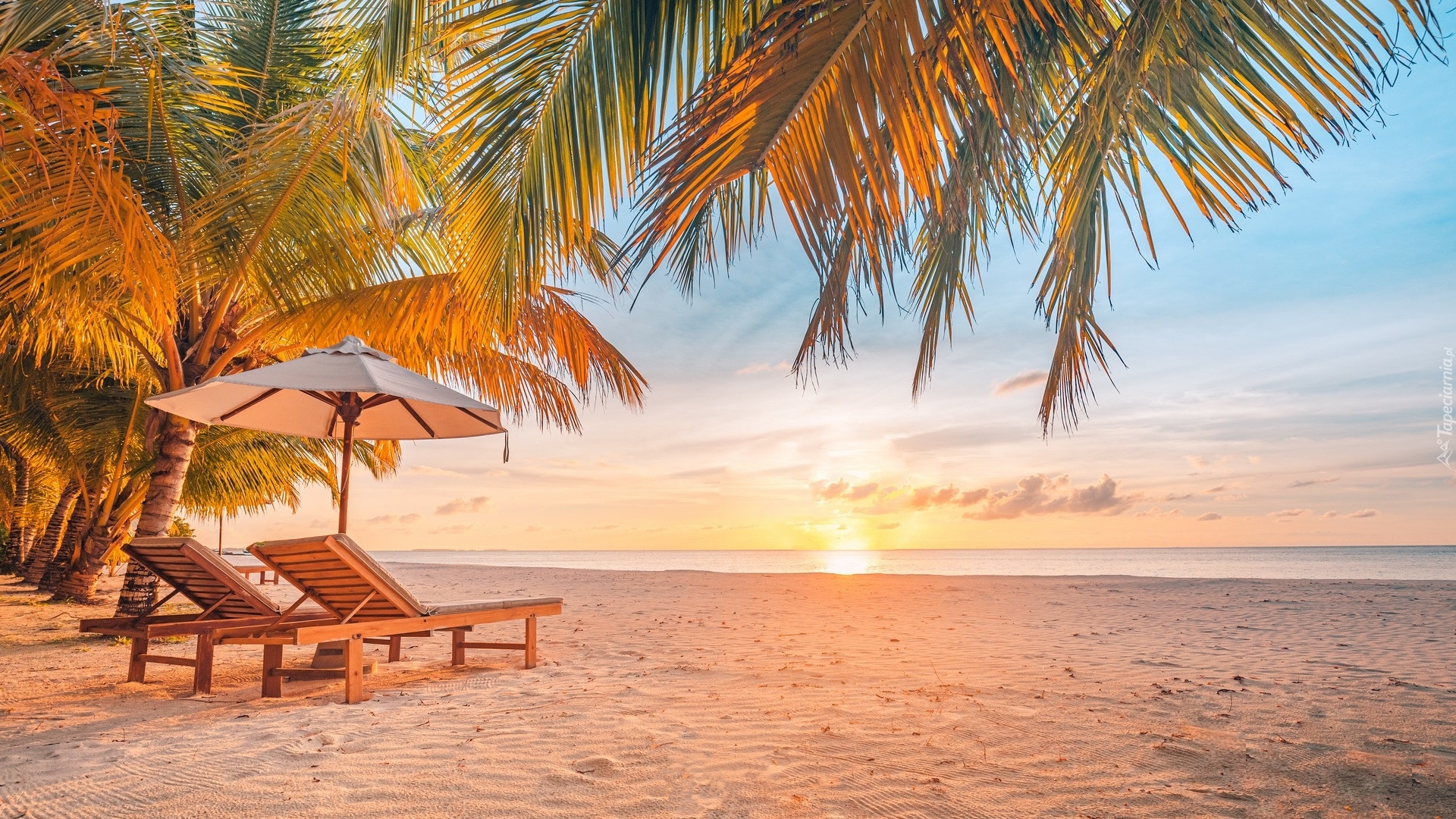 Edytor tapety: Leżaki pod parasolami i plaża na wyspie Dhigurah