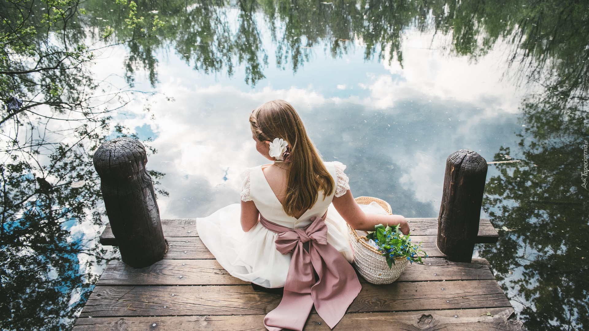 Edytor tapety: Dziewczynka z koszykiem kwiatów na pomoście