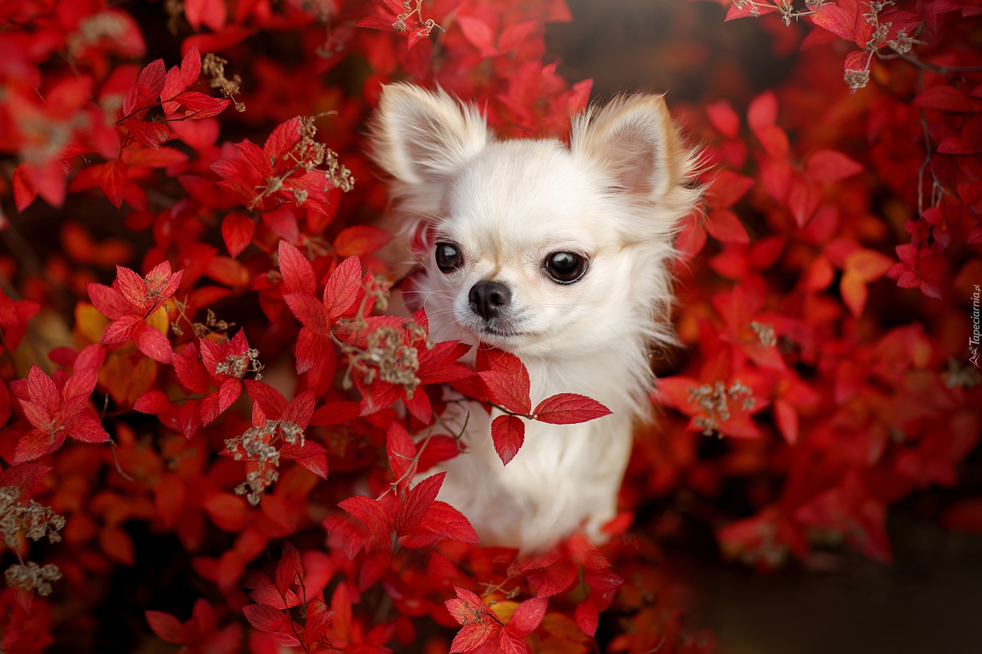 Edytor tapety: Chihuahua wśród czerwonych liści krzewu
