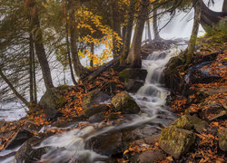 Edytor tapety: Strumień na kamieniach wśród drzew obok wodospadu Bond Falls