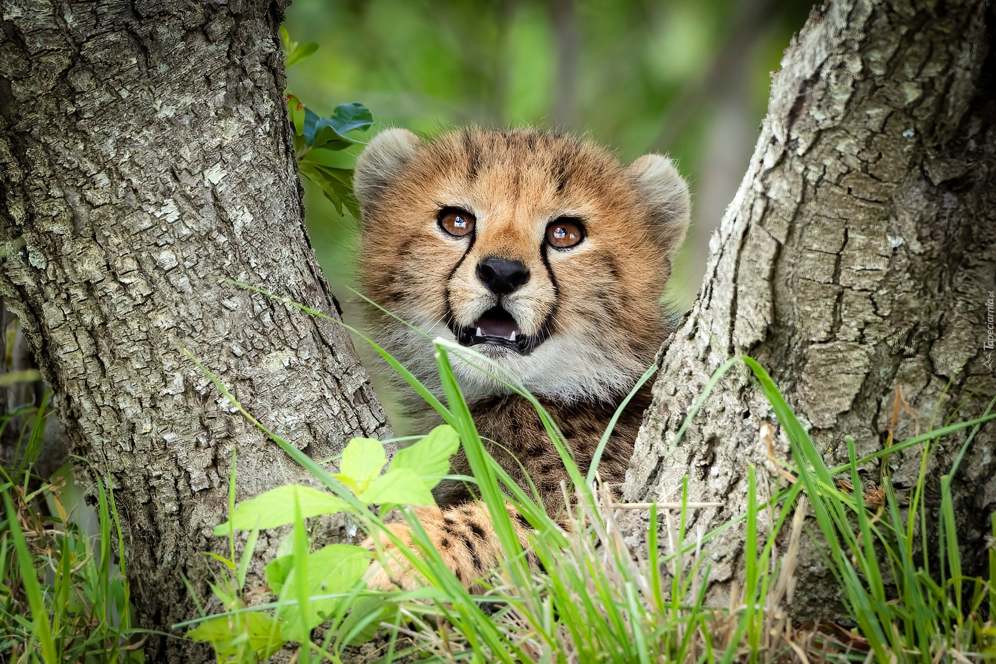 Edytor tapety: Młody gepard pomiędzy pniami drzew