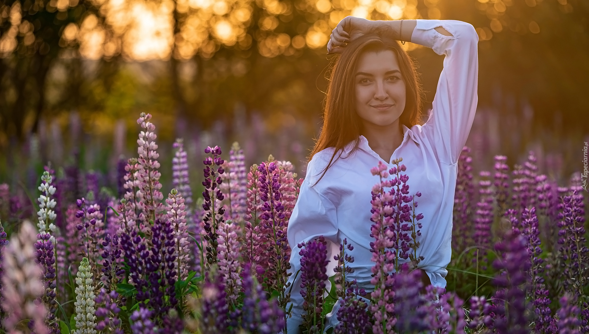 Edytor tapety: Kobieta w białej bluzce wśród łubinów