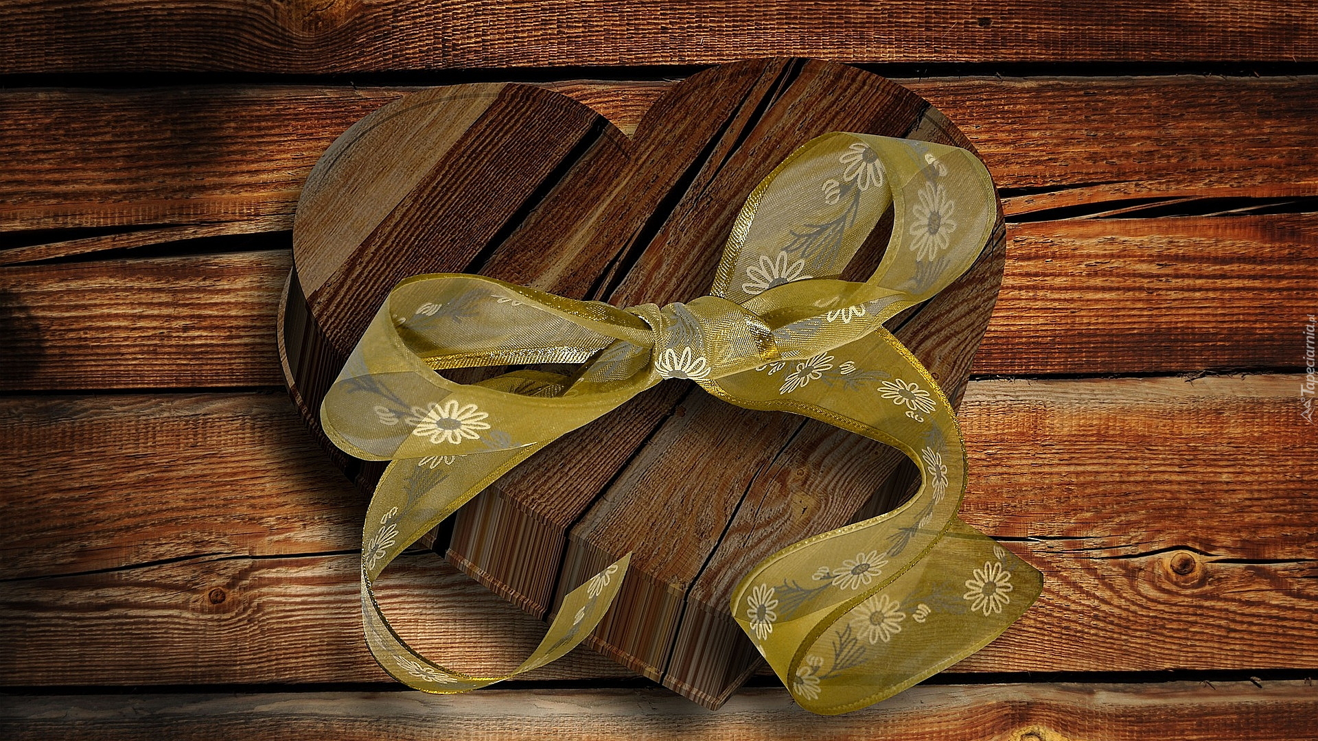 Edytor tapety: Drewniane serce ze wstążką na deskach