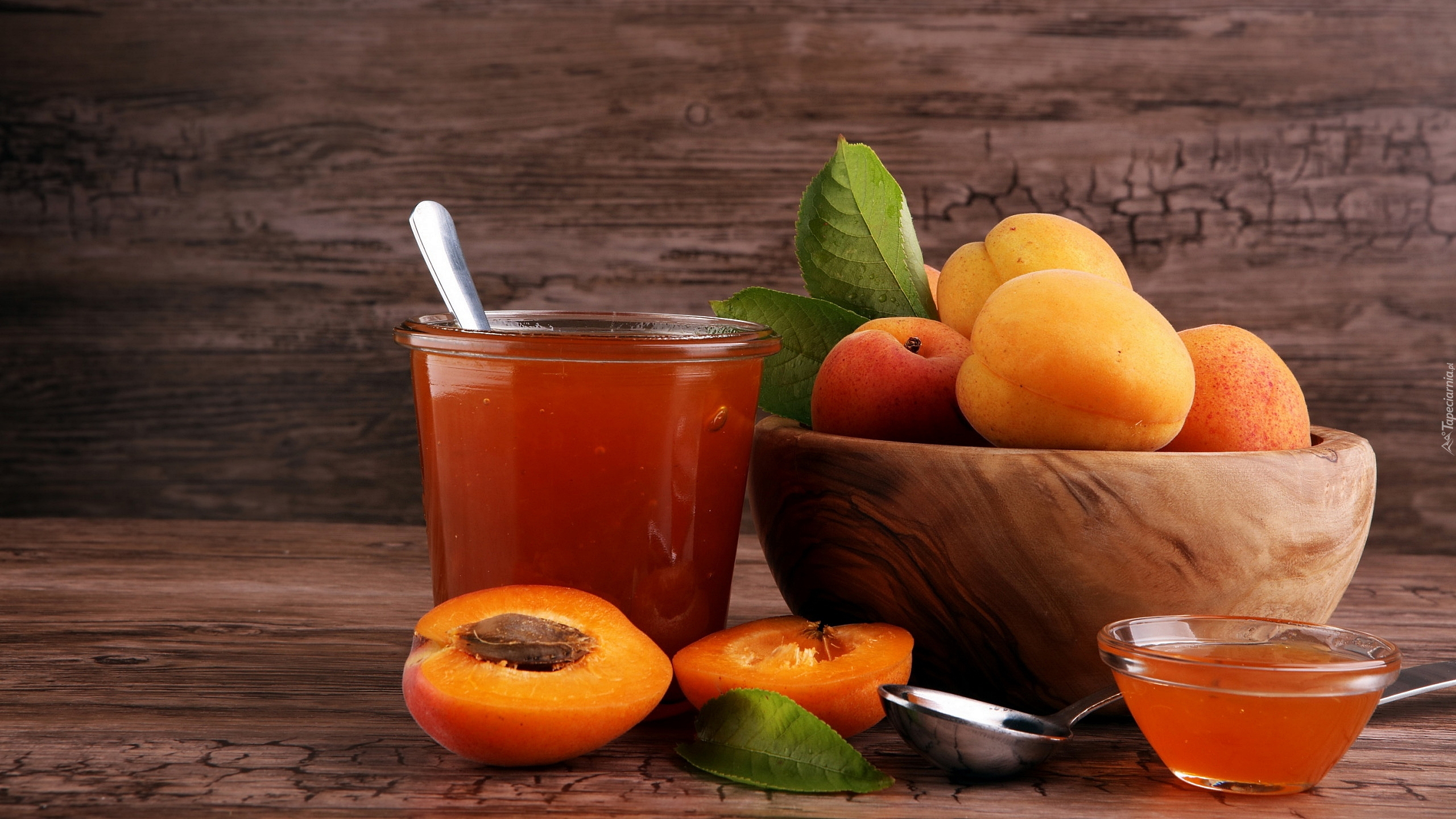 Edytor tapety: Słoik dżemu obok moreli w misce