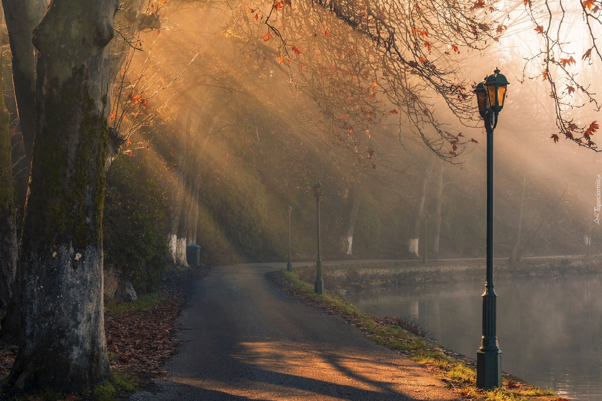 Edytor tapety: Latarnie przy alejce obok drzew w parku