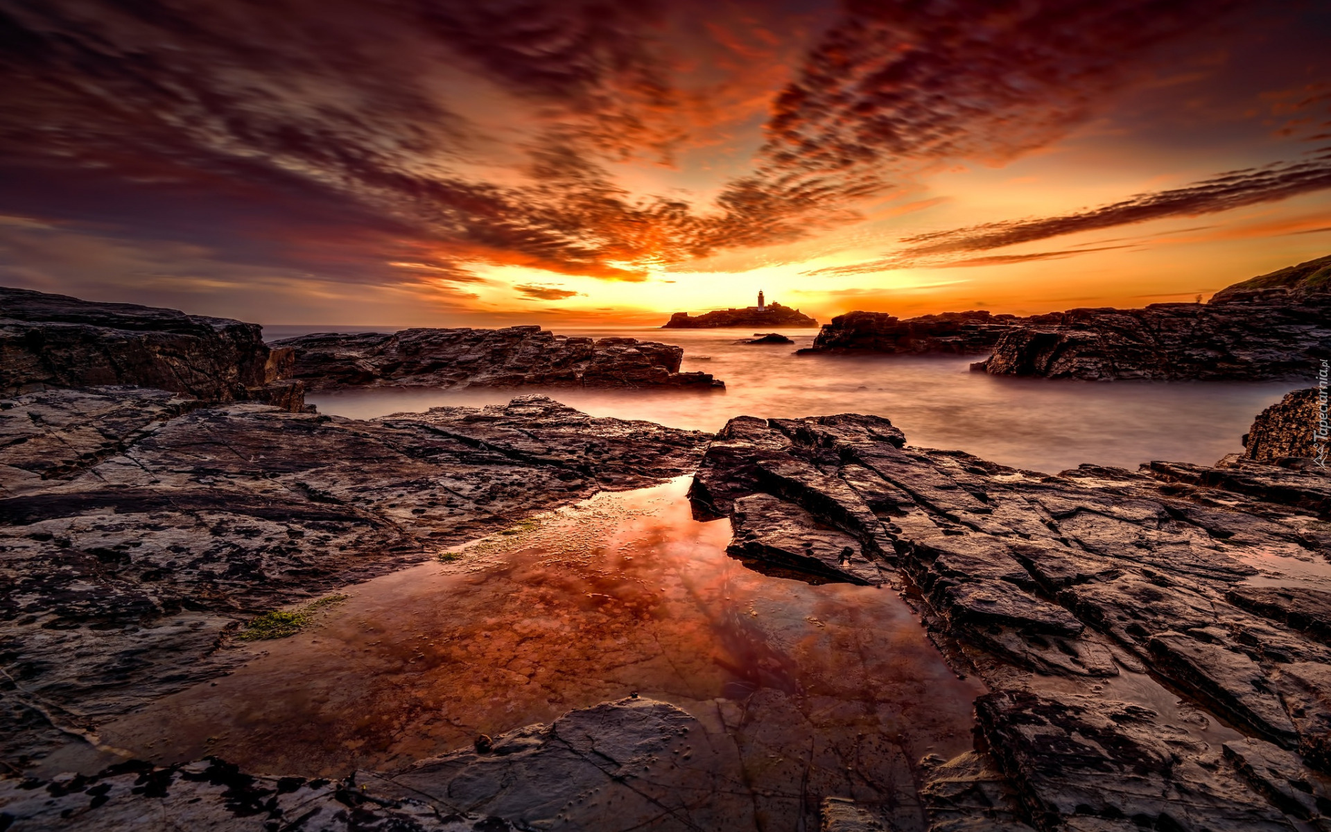 Edytor tapety: Skały i latarnia morska na tle zachodu słońca