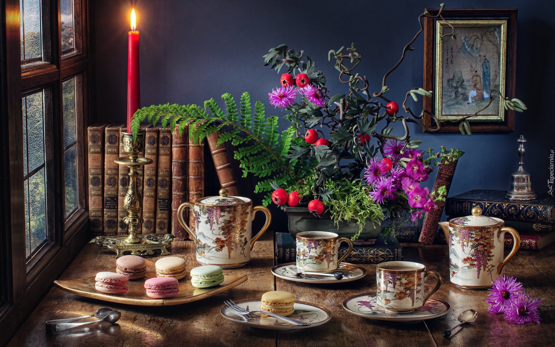 Edytor tapety: Porcelanowa zastawa obok książek na stole przy oknie