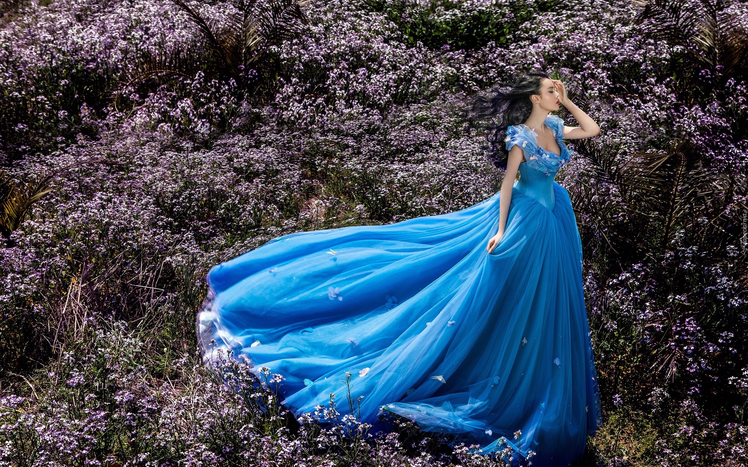 Edytor tapety: Kobieta w niebieskiej sukni na łące