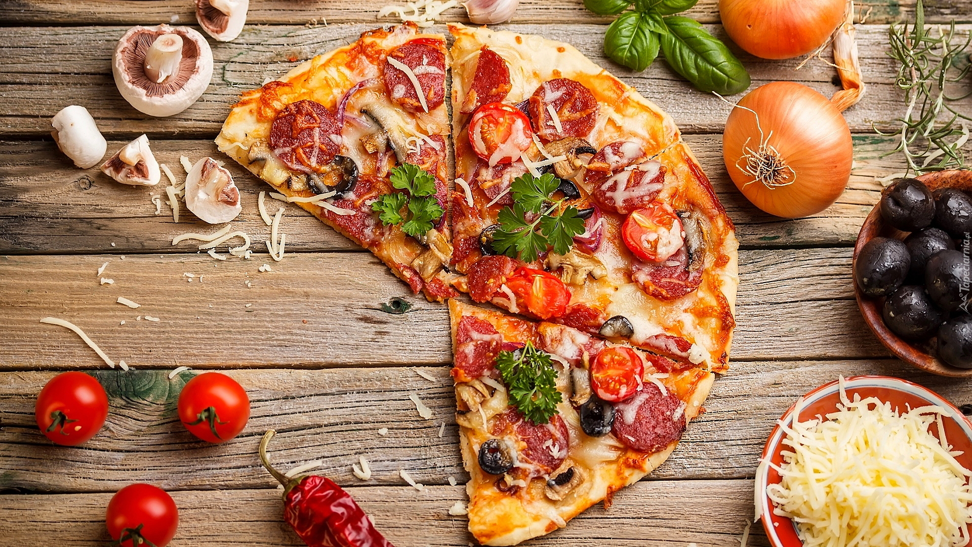 Edytor tapety: Kawałki pizzy na deskach
