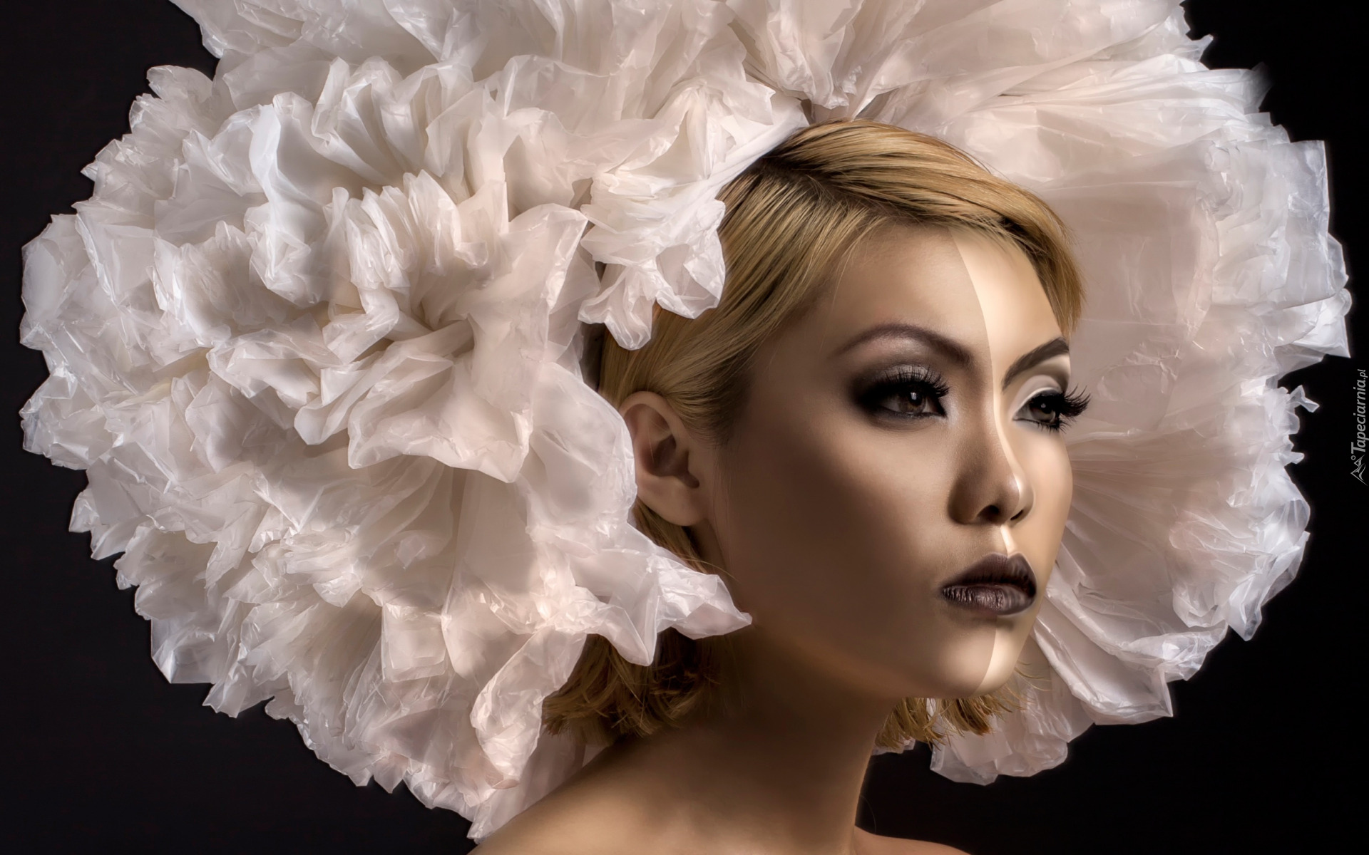 Edytor tapety: Kobieta w kapeluszu ze sztucznych białych kwiatów