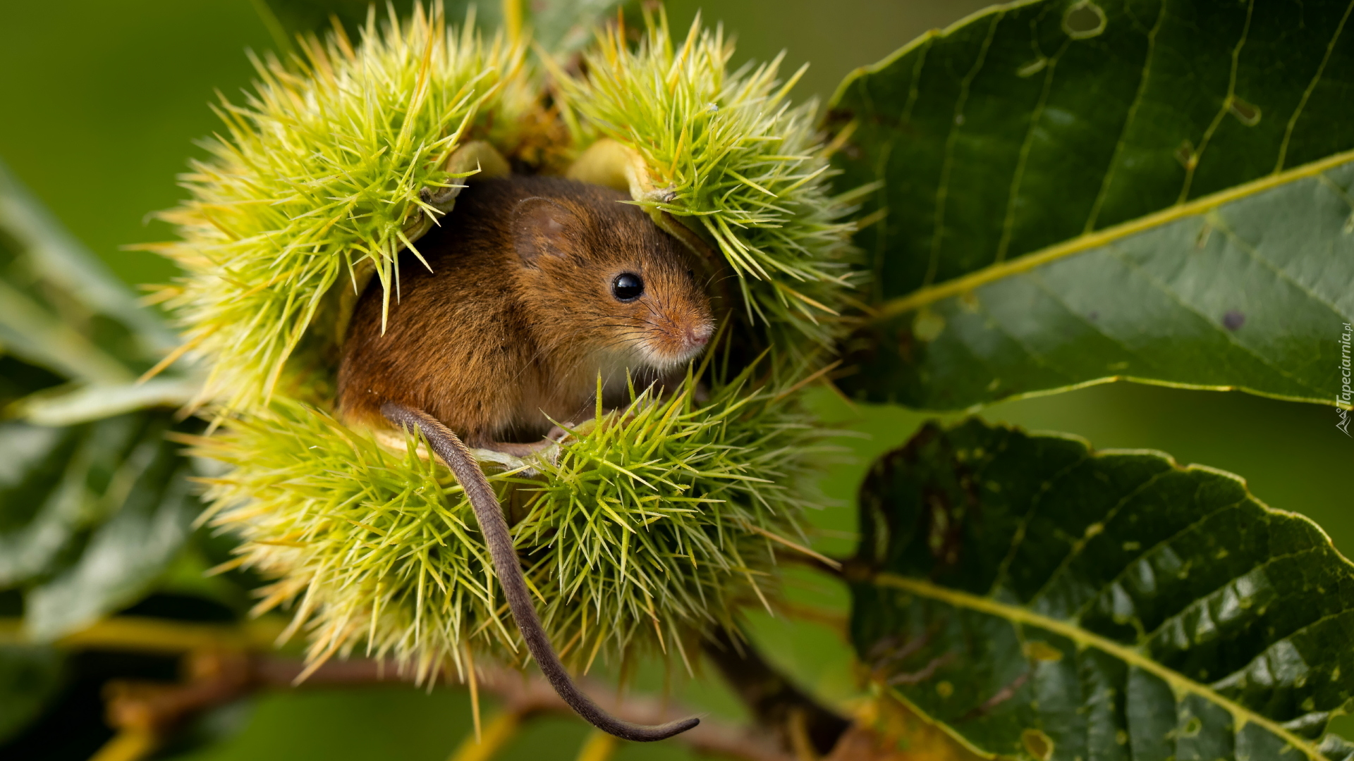 Edytor tapety: Myszka w łupinie kasztana jadalnego