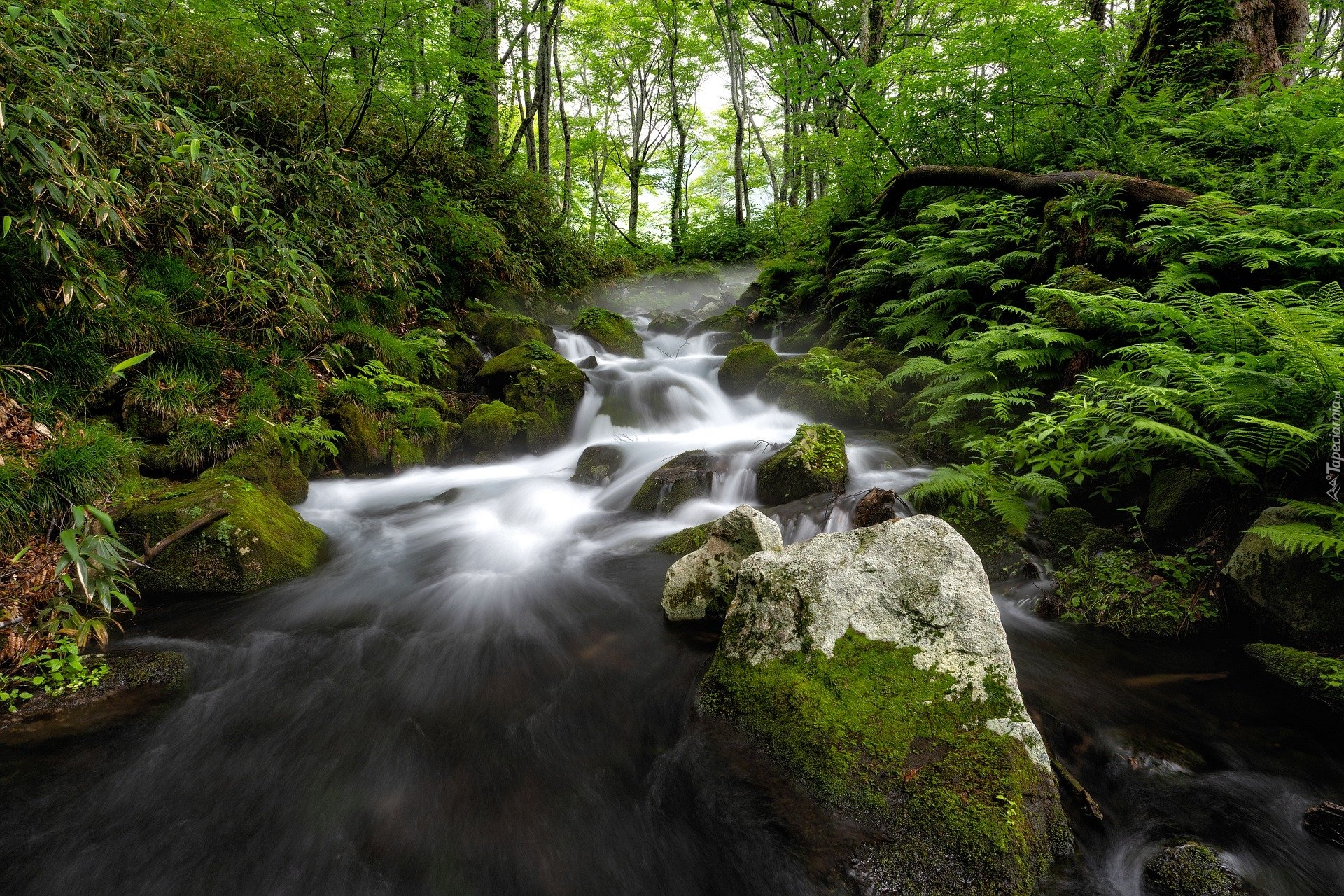 Edytor tapety: Omszałe kamienie w strumieniu pośród drzew