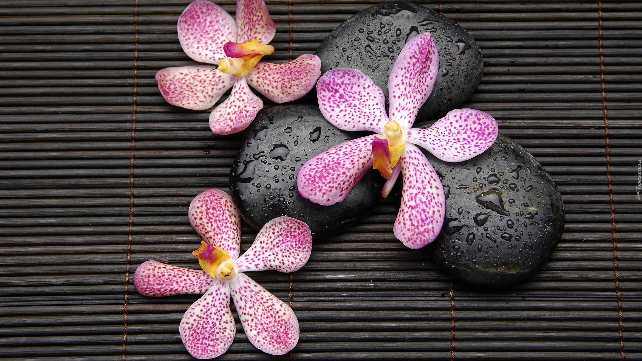 Edytor tapety: Kwiaty storczyka na mokrych kamieniach