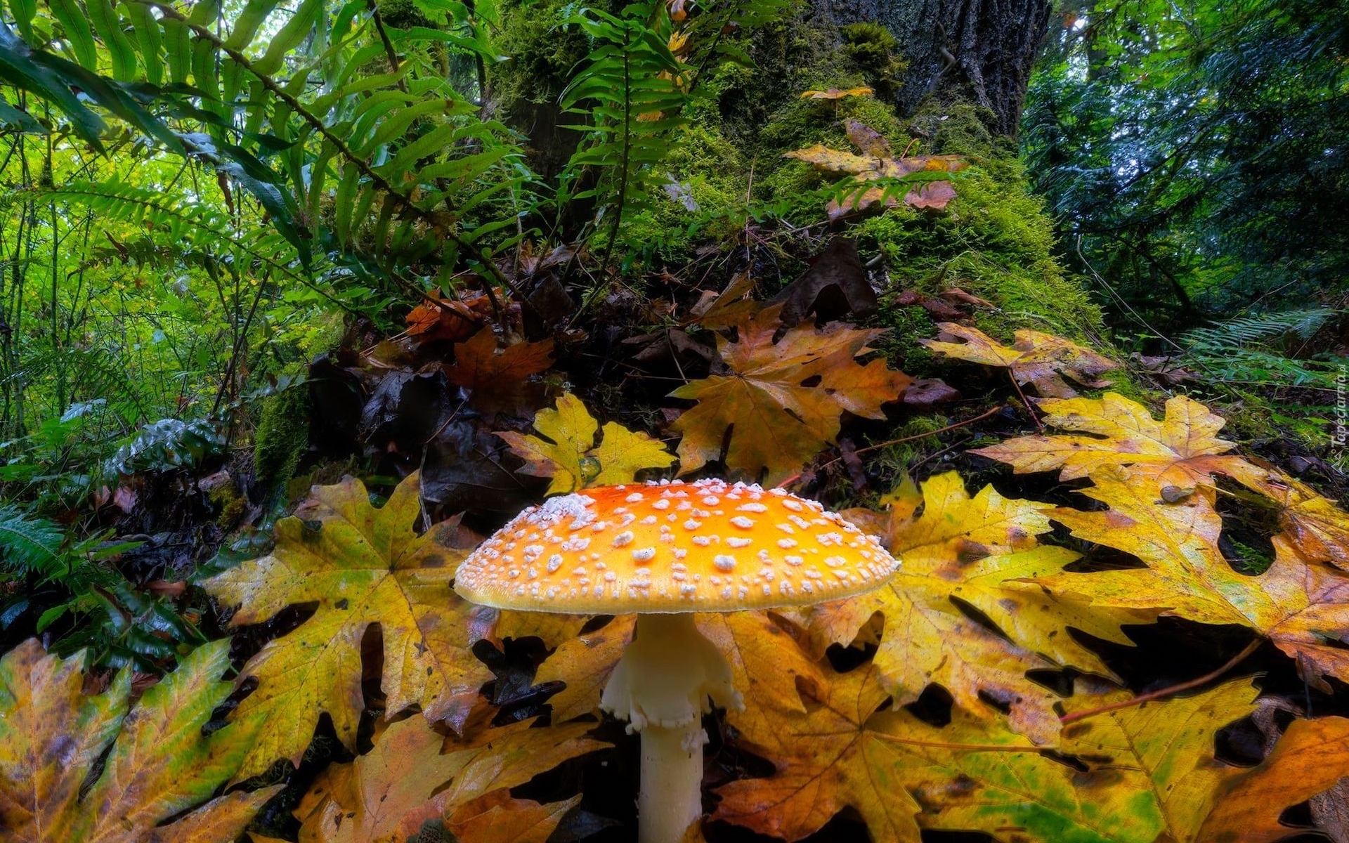 Edytor tapety: Muchomor wśród jesiennych liści i paproci