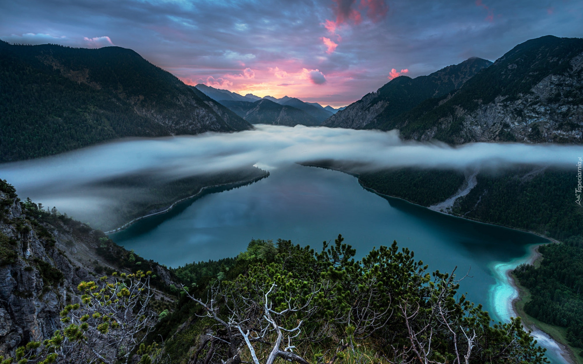 Edytor tapety: Wieczorna mgła unosząca się nad jeziorem w górach
