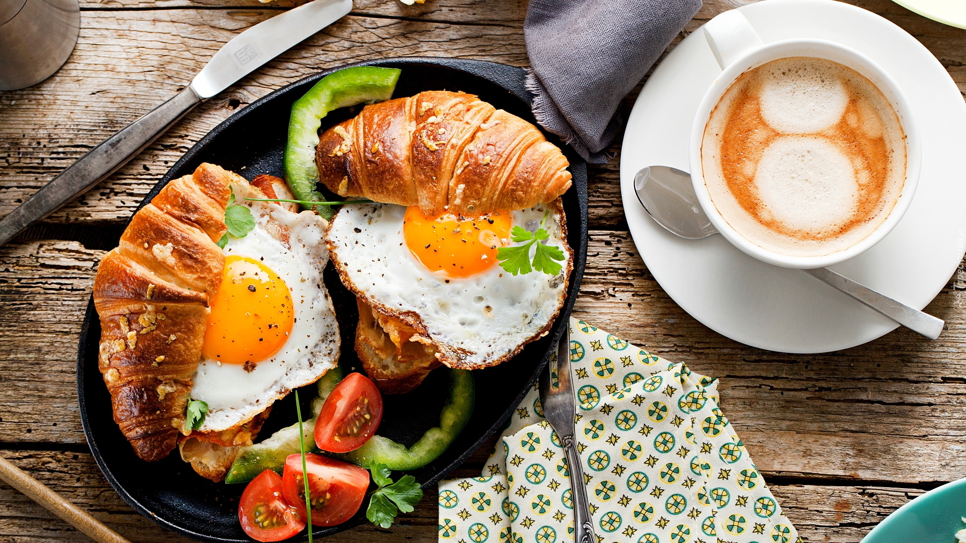 Edytor tapety: Rogaliki i jajka sadzone obok filiżanki kawy