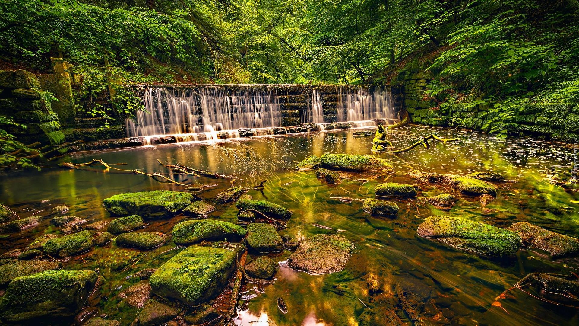 Edytor tapety: Omszałe kamienie w rzece na tle wodospadu